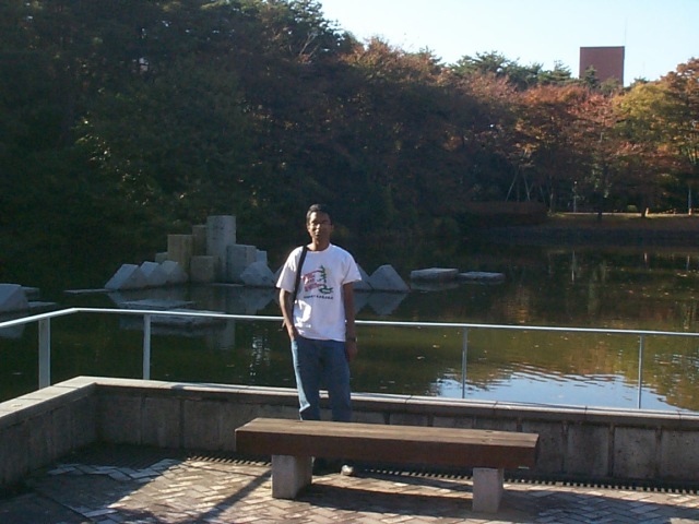 Ganesh in front of a random sculpture in a lake at ETL, Tsukuba |