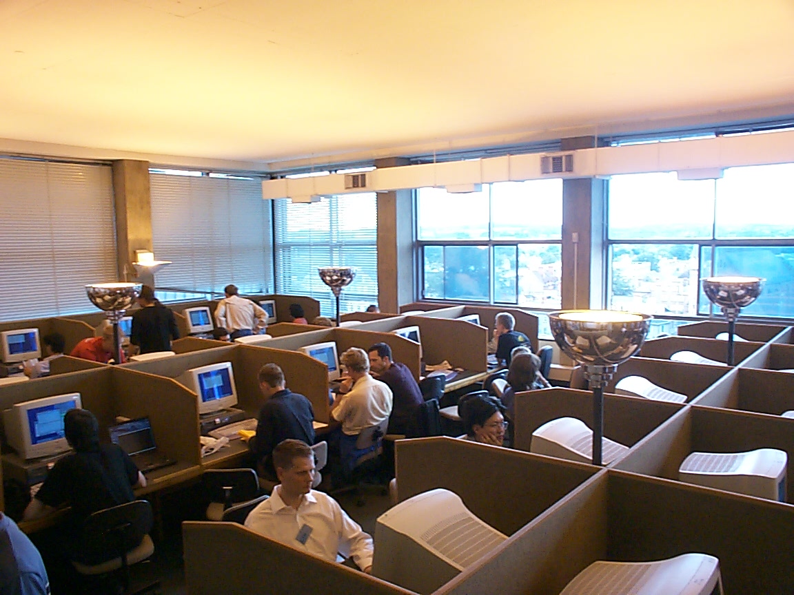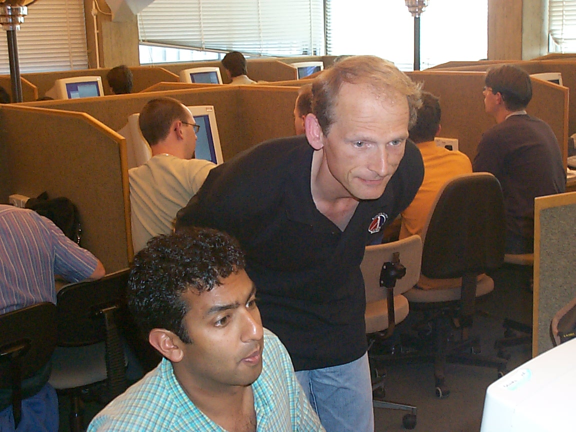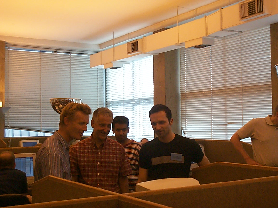 Simon Peyton-Jones, Paul Hudak, Michael Dalal and Manuel Chakravarty look at something (probably a robot) |