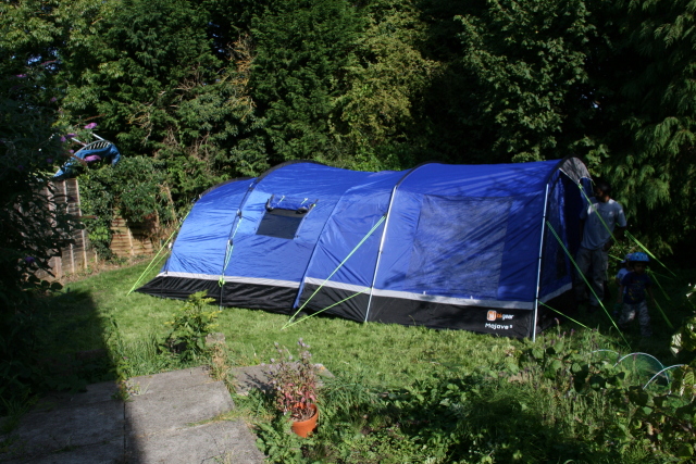 Our new tent come palace (Hi Gear Mojave 5 bed, plus porch) in Caroline and Ian's garden.