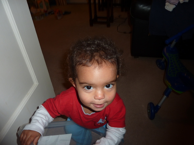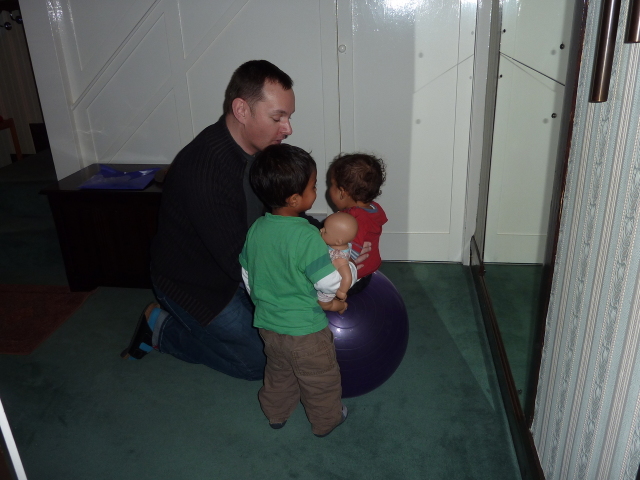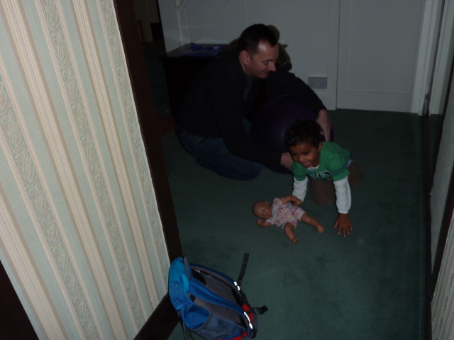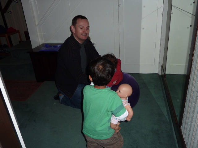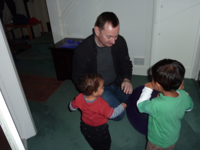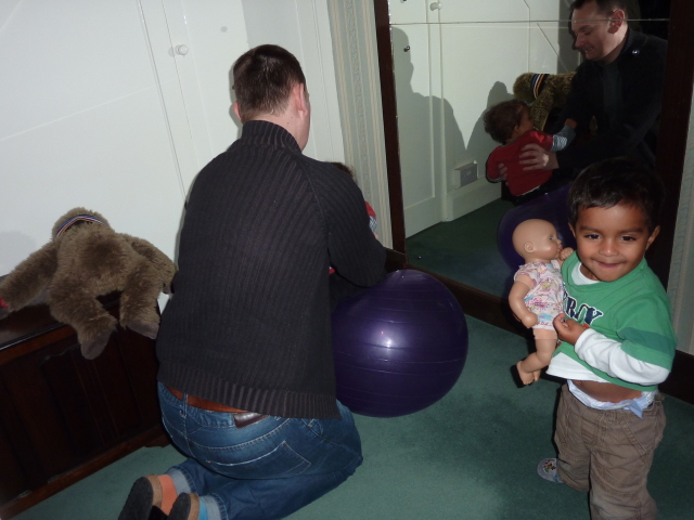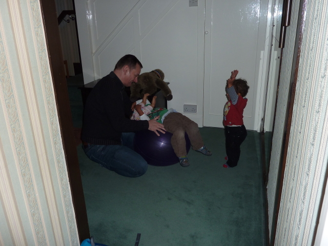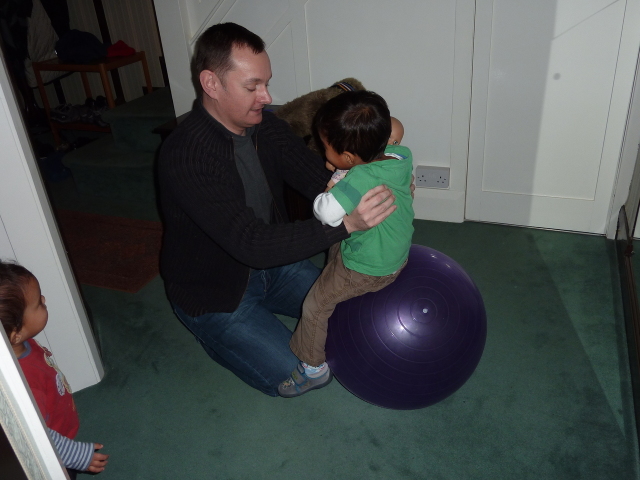 Alex on an exercise ball (Heather wants a go) |