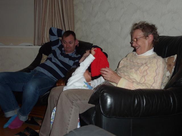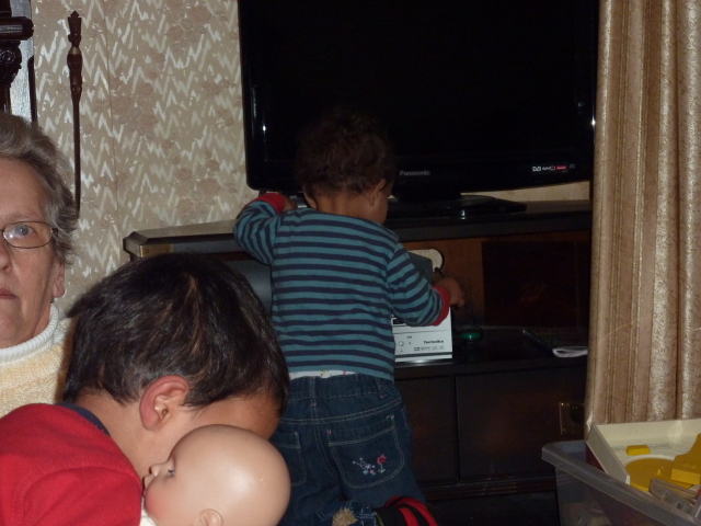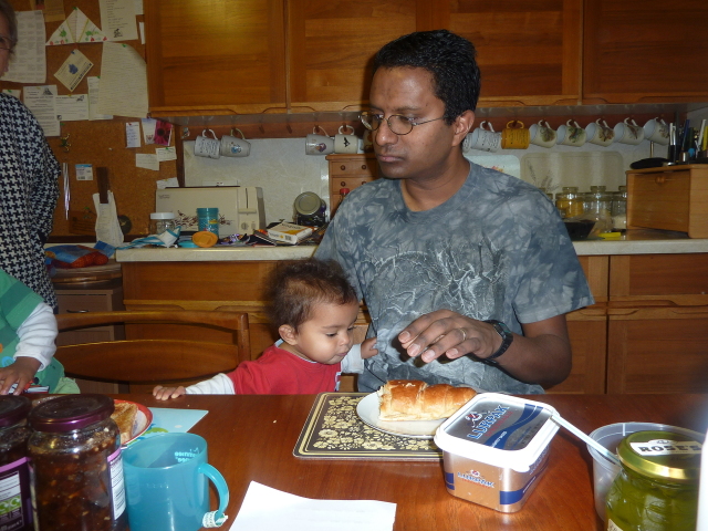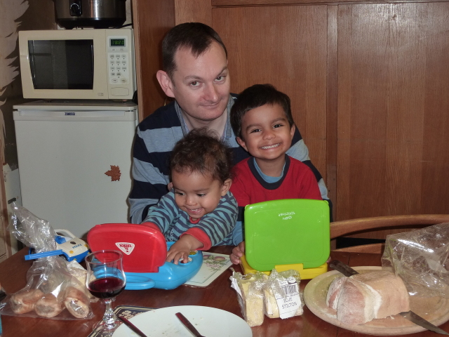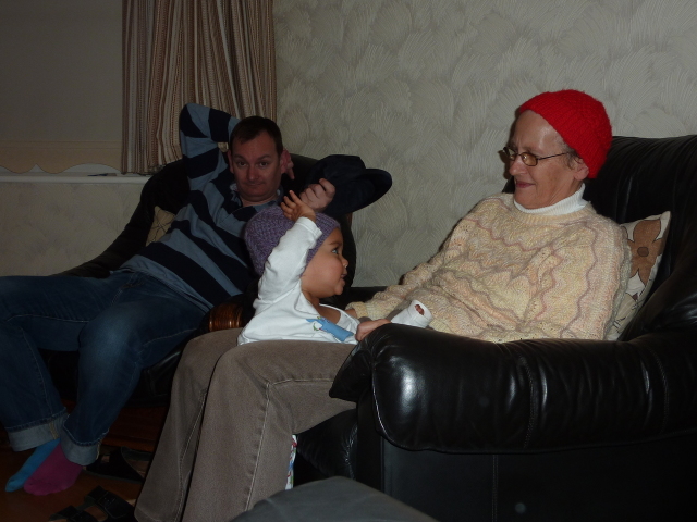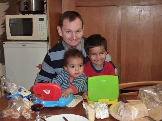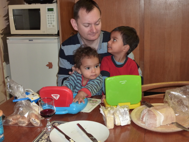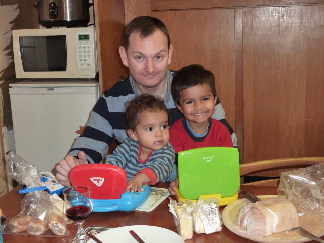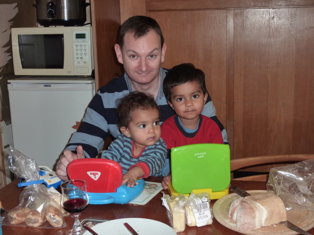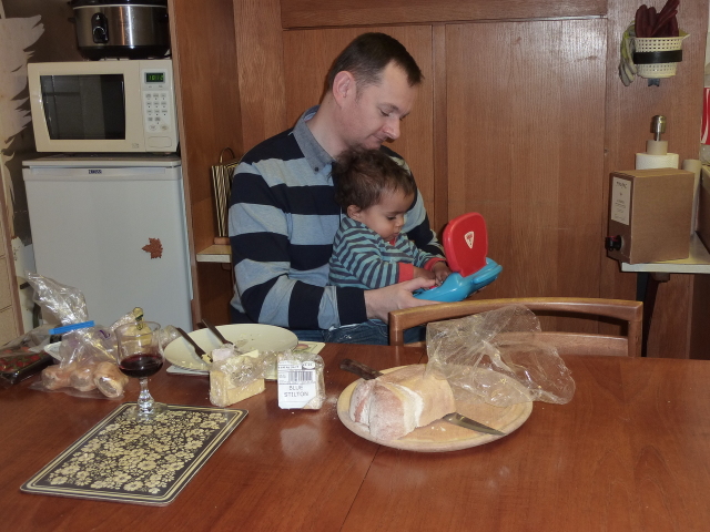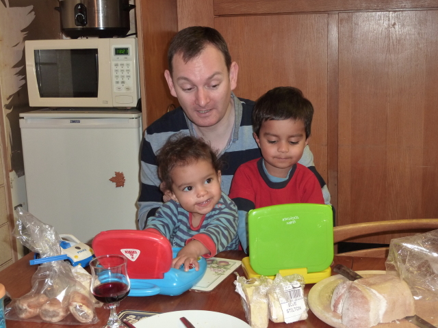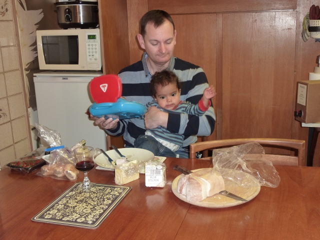 Uncle David juggles Heather, laptop and cheese. |