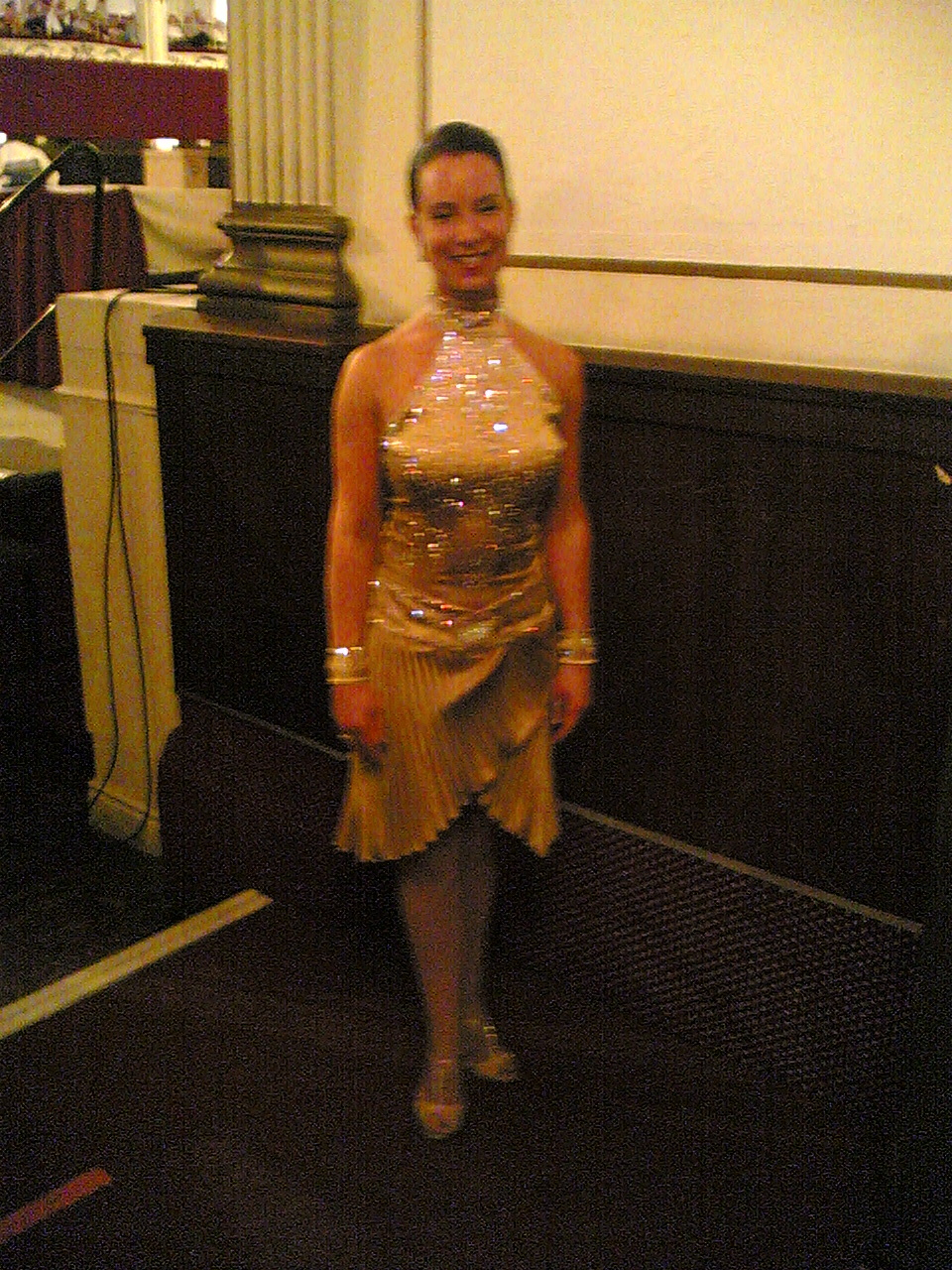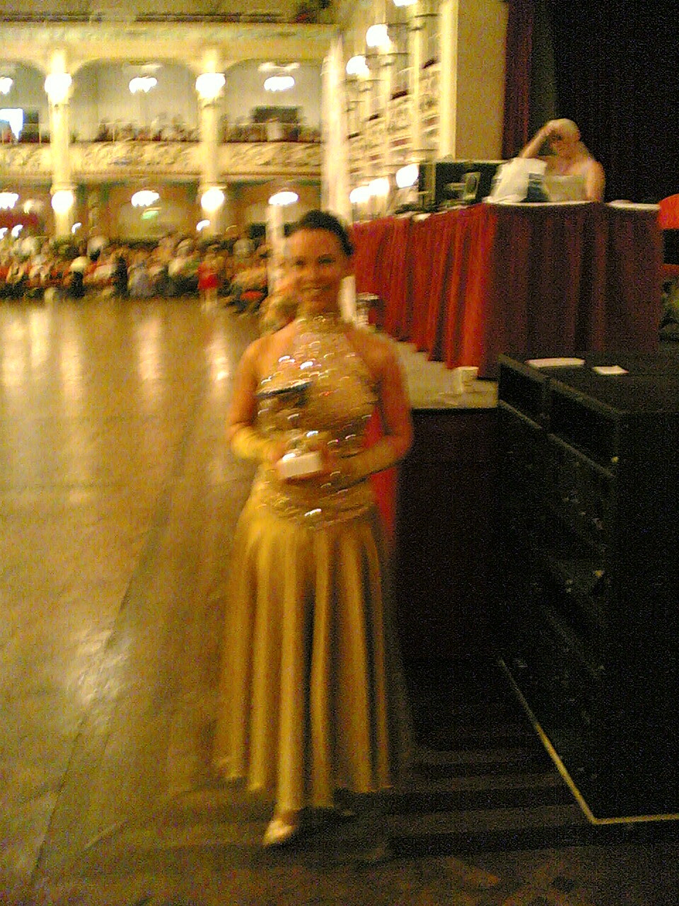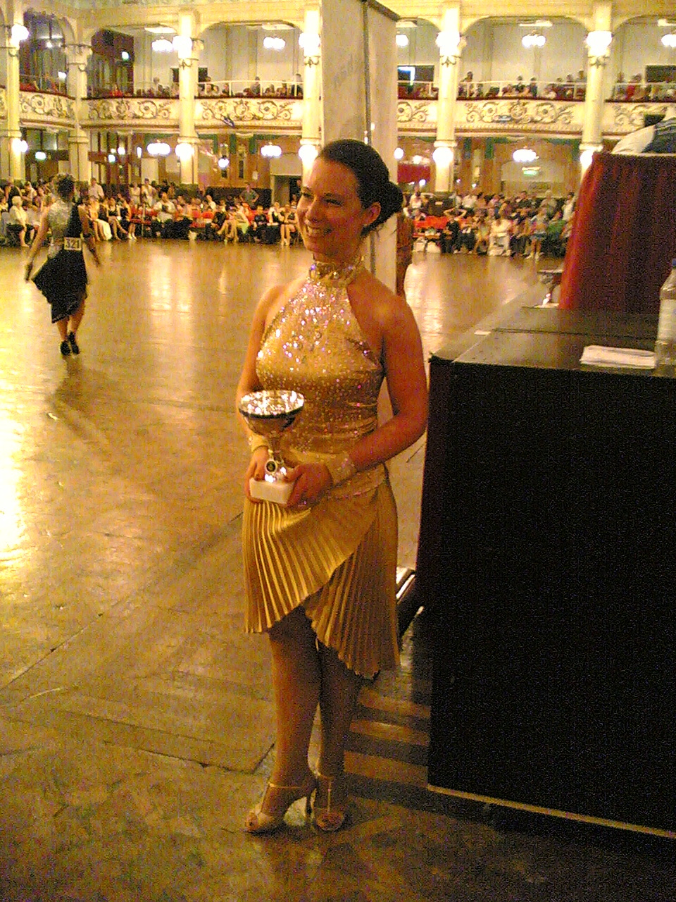 A lesson in how to take a blurry photo. It's arty, really... What it is meant to be is Karen winning the adult women ballroom, and looking justifiably pleased! |