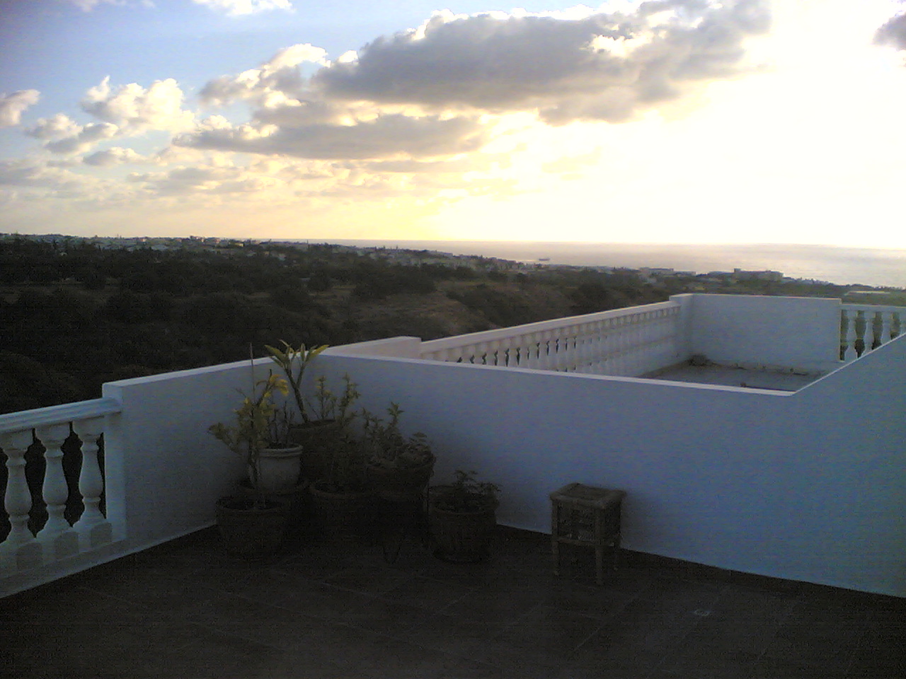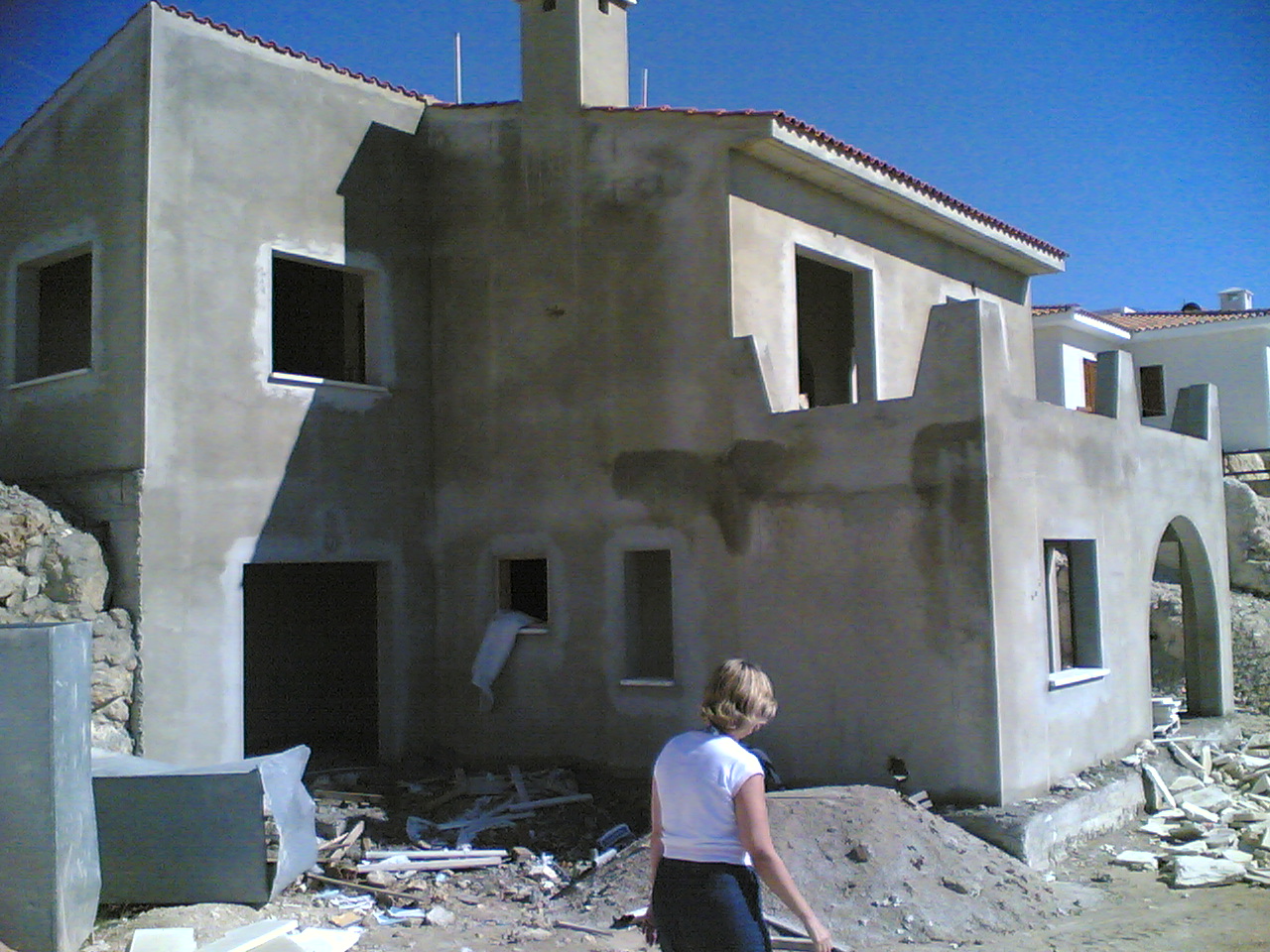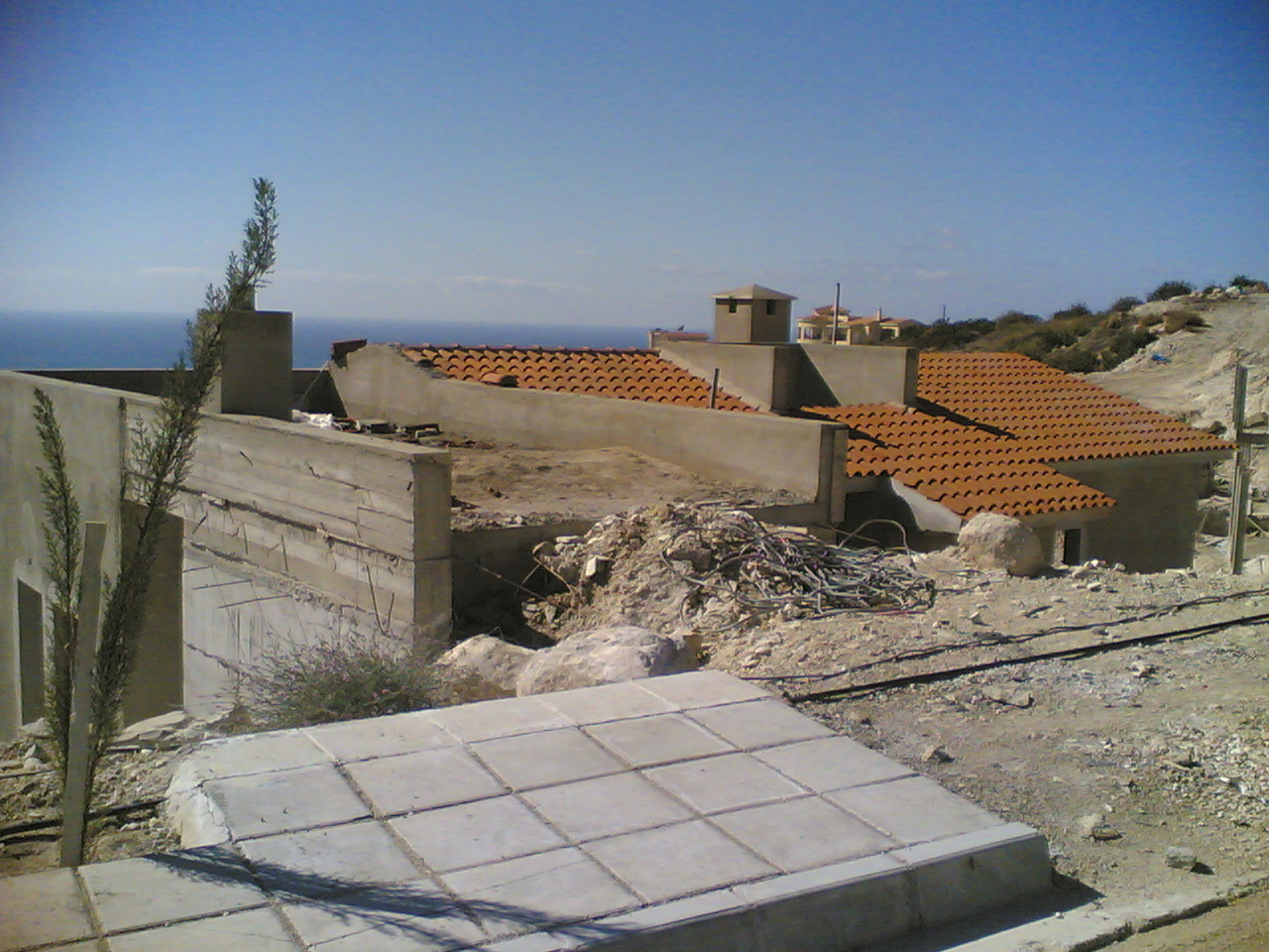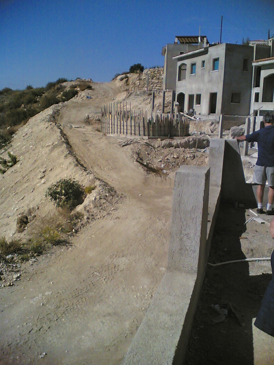 This is the villa that mum and Nigel are having built. Well, it is the top of it. The villa is on the side of a hill. This photo is taken from the road , with the not quite complete pavement in the foreground. The drive is to the left of the villa, on top of it, and the roof is to the right. |