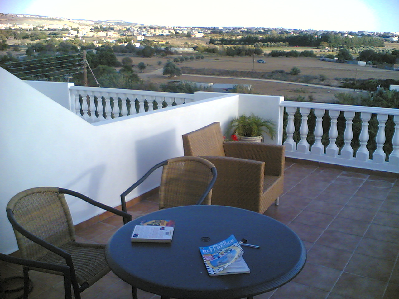 This is the view from the balcony. As you can see it's a nice view down the valley and out over the fields to the sea :)