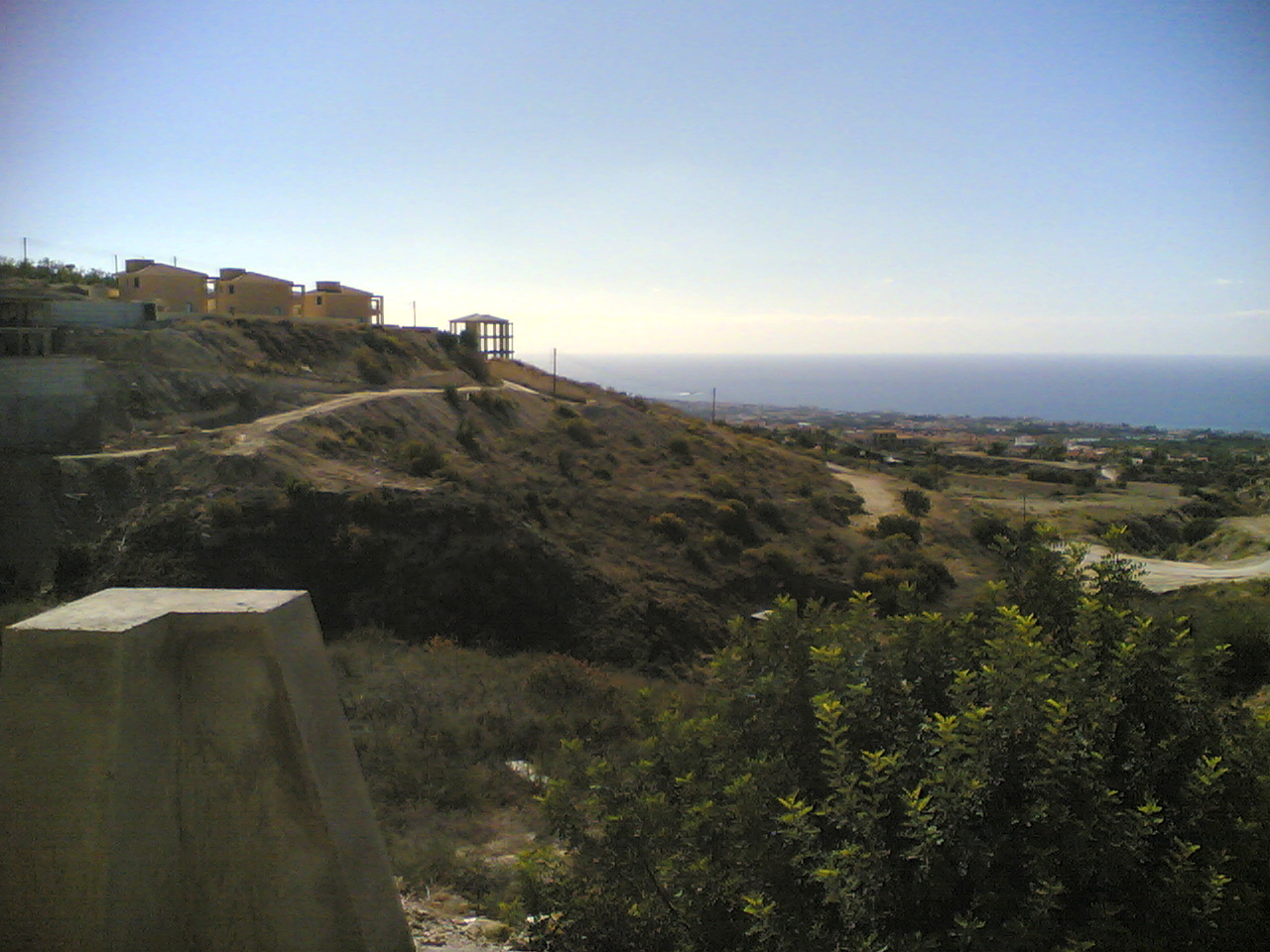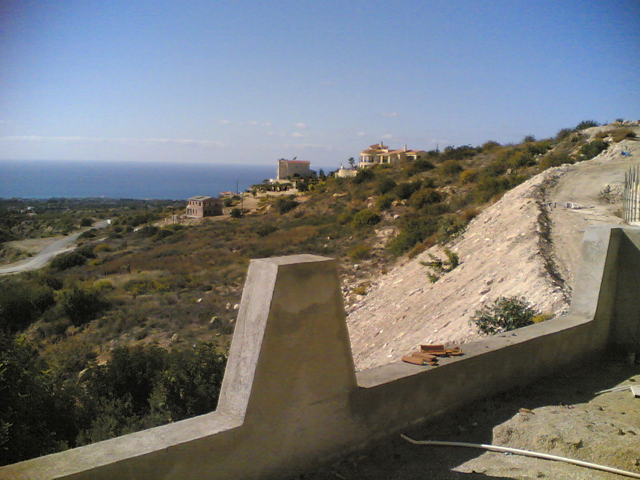 This is the villa that mum and Nigel are having built. Well, it is the top of it. The villa is on the side of a hill. This photo is taken from the road , with the not quite complete pavement in the foreground. The drive is to the left of the villa, on top of it, and the roof is to the right.