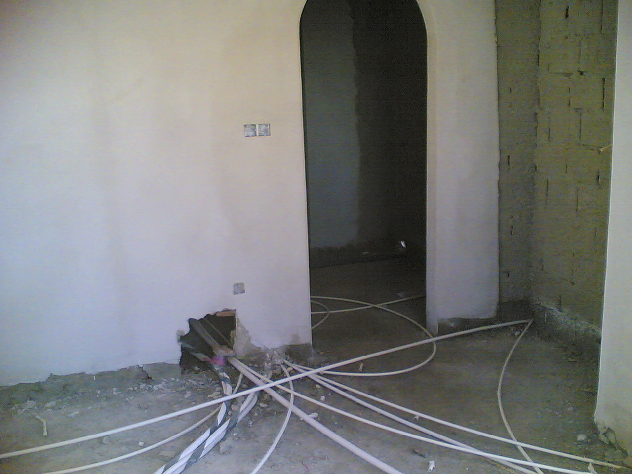 The upstairs hallway. The pipes for water and electrical wires are all laid out first, and then covered in a few inches of concrete.