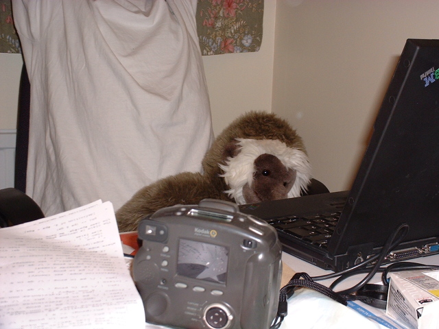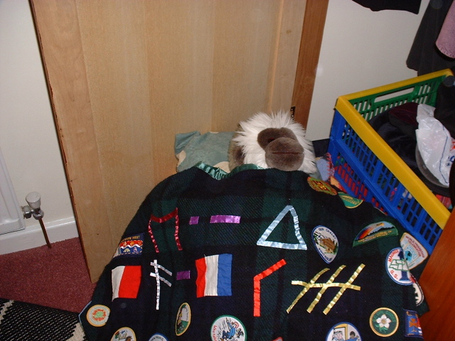 Seamus has his own bed on an upturned crate, with his own soft mattress and pillow and blanket