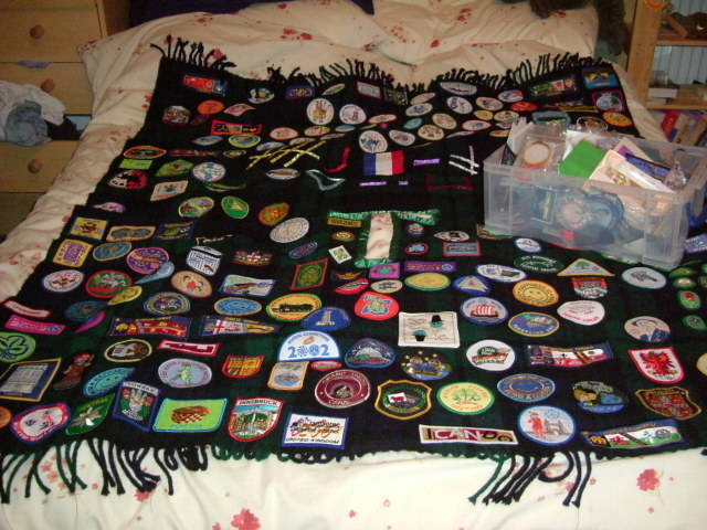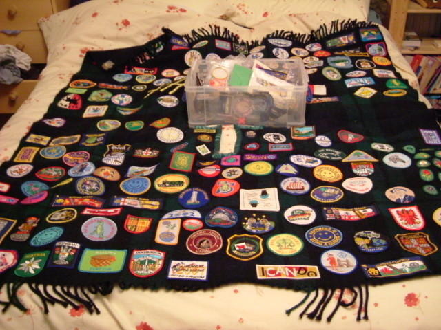 The old blanket and a 9L box with the unsewn badges, before I transfer everything to my new blanket.
