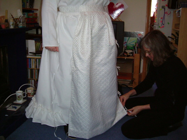 Over that goes a decorative forepart, just in the front. This is why there's a gap in the ruffles of the petticoat. |