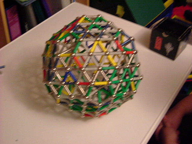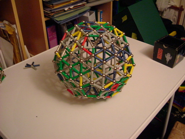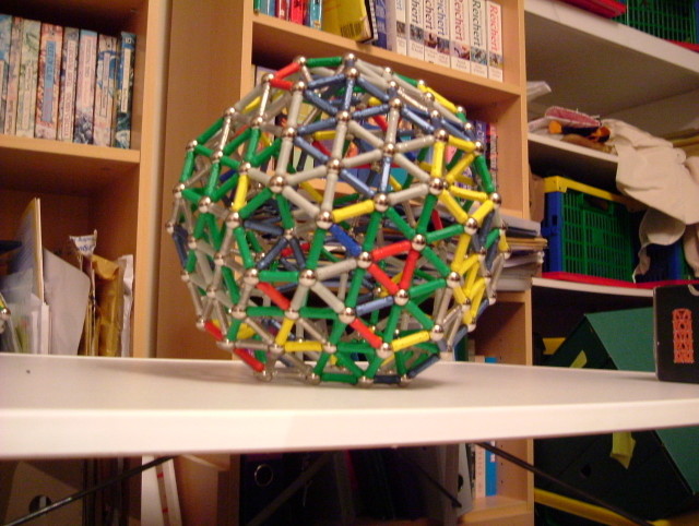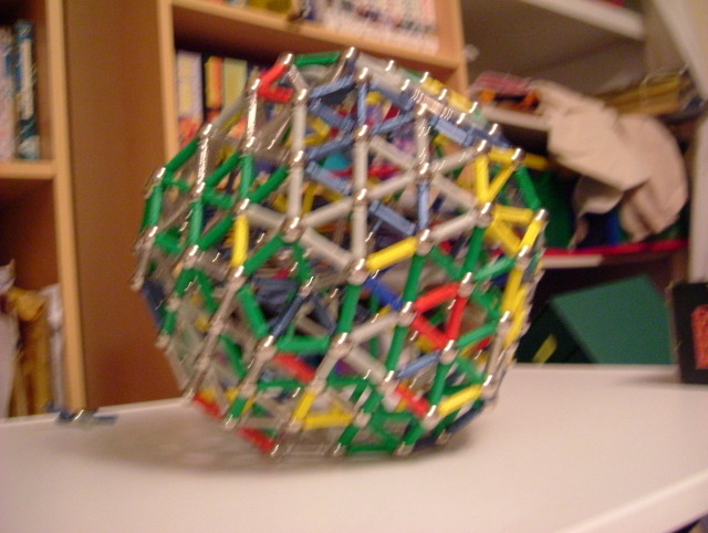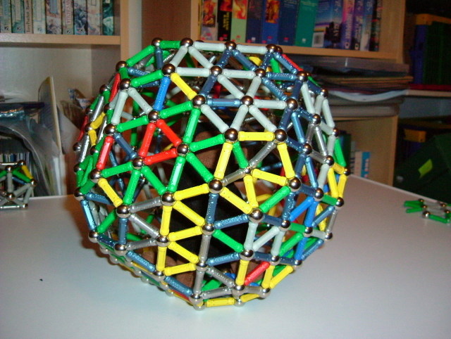 480 bars, icosahedric sphere, 20 triangular sides of length 4 bars, each base cell has 30 bars