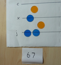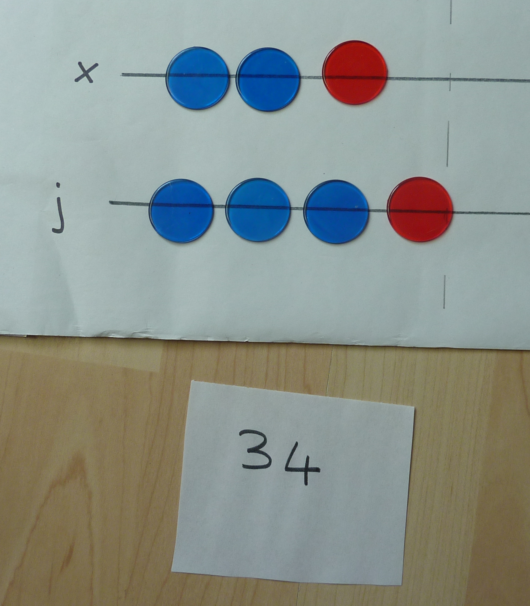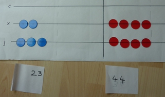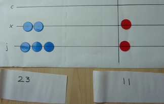 First of all, we will use the first two panels on the cloth to lay out the two numbers we are adding together. I am going to do the sum 23 + 11.
