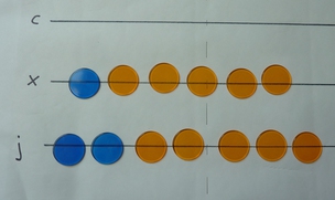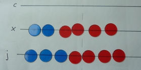 What can we reduce? Start at the bottom... There are more than five counters in the 1s row, so remove them and replace with one counter in the 5s row. There are also more than five counters in the 10s row, so remove them and replace with one counter in the 50s row.