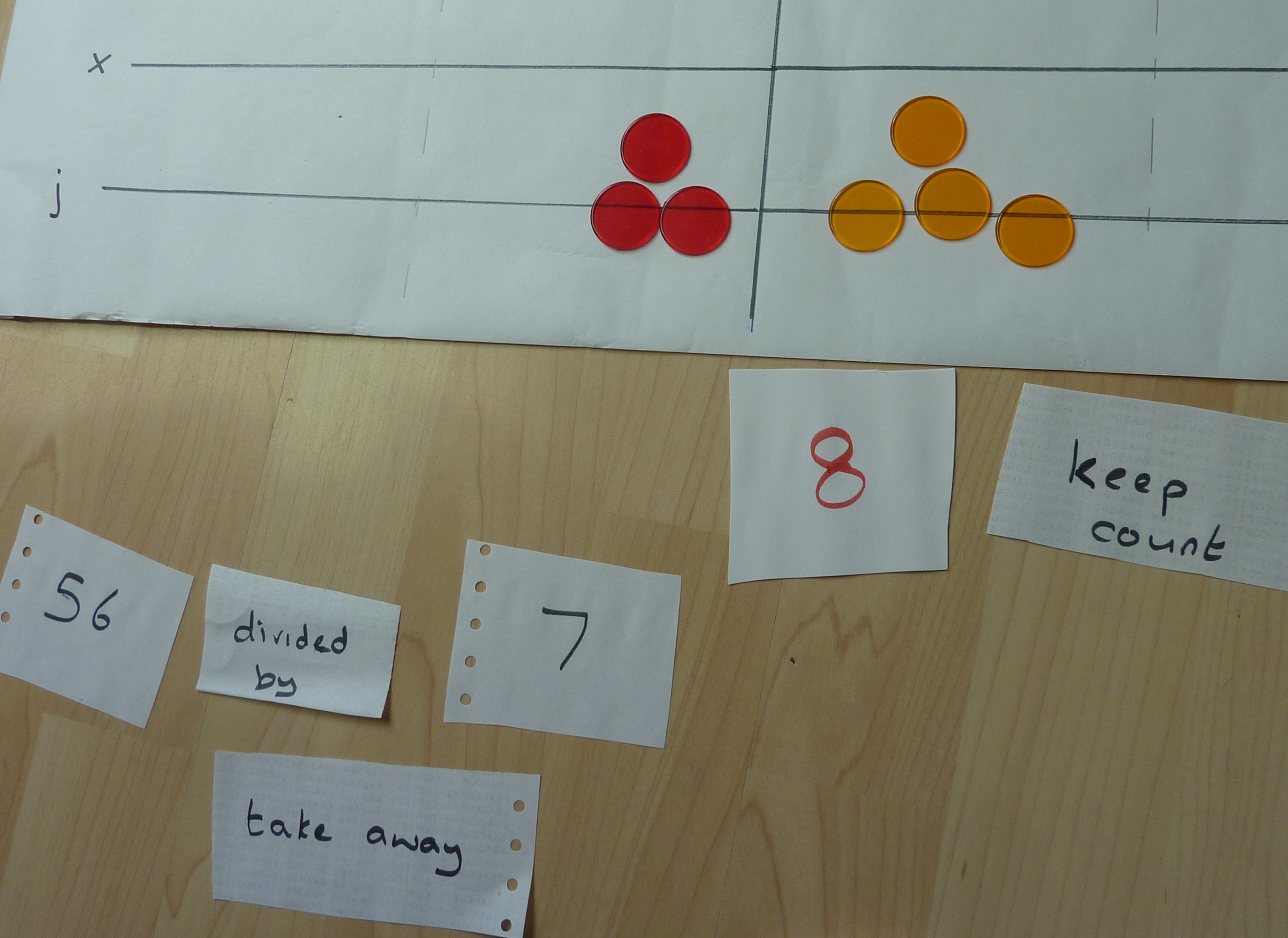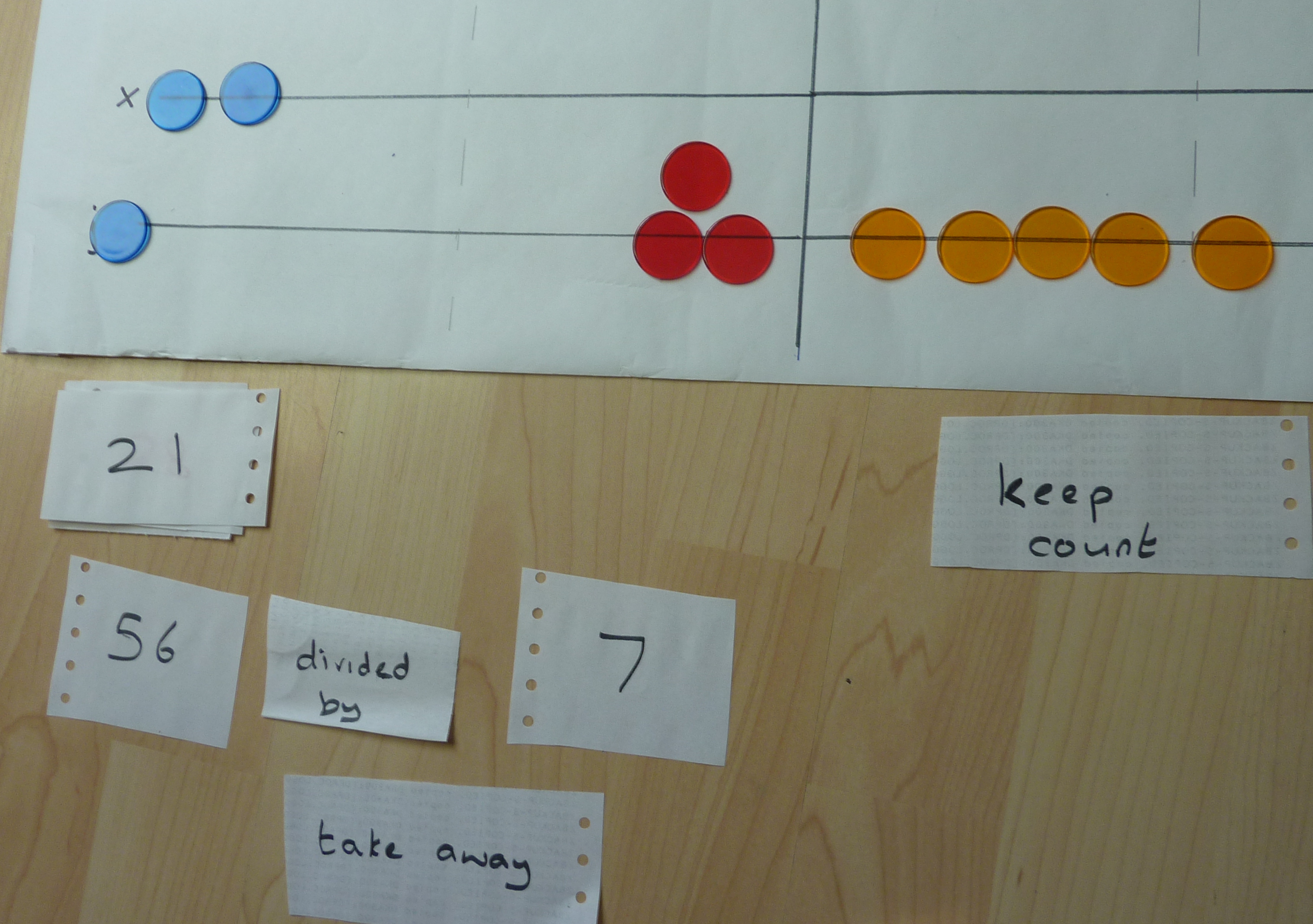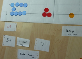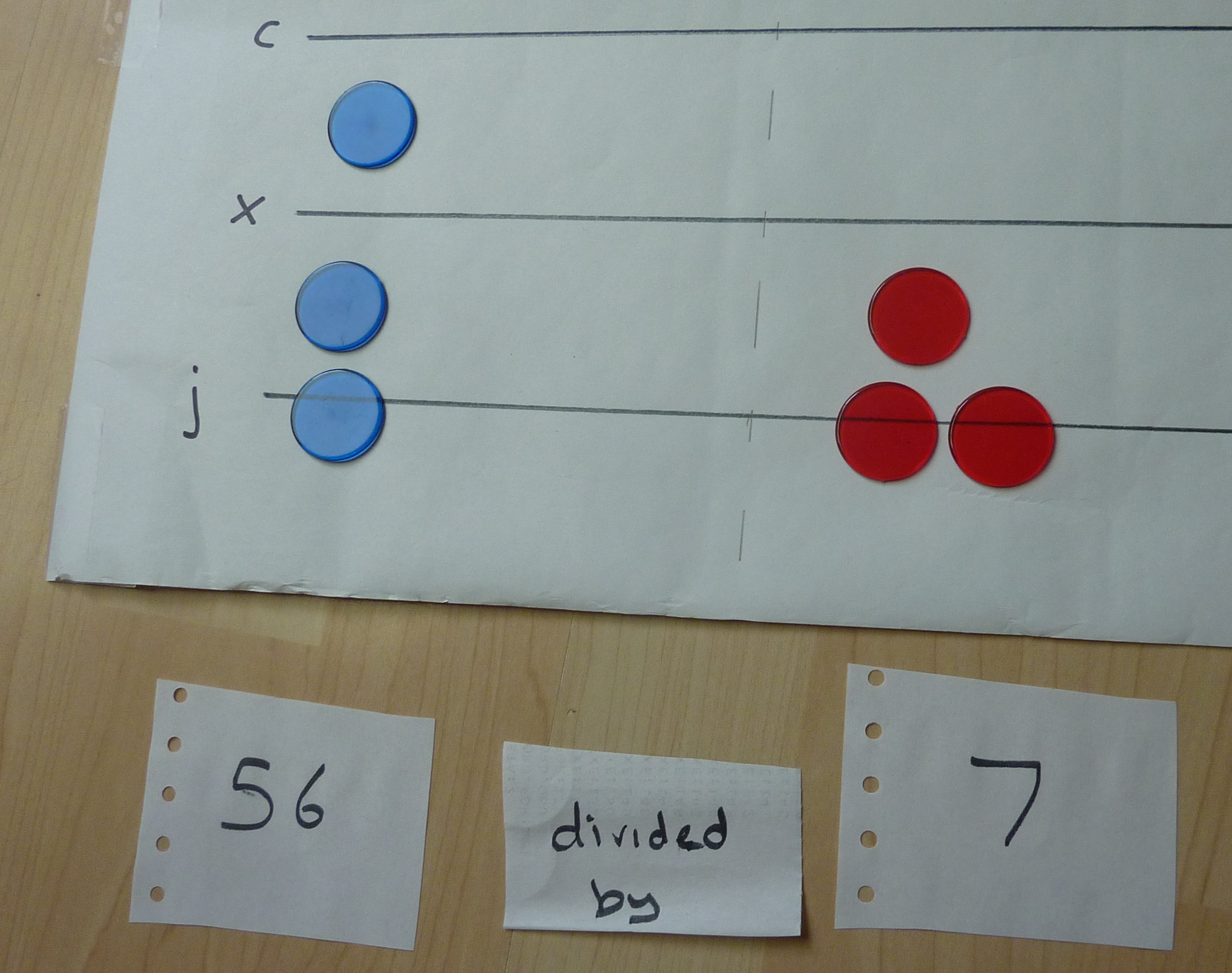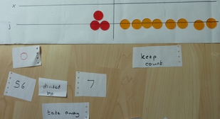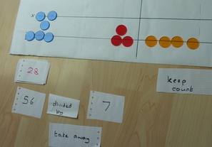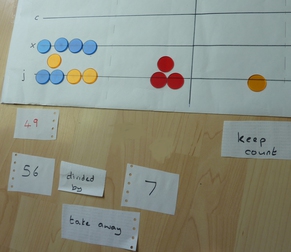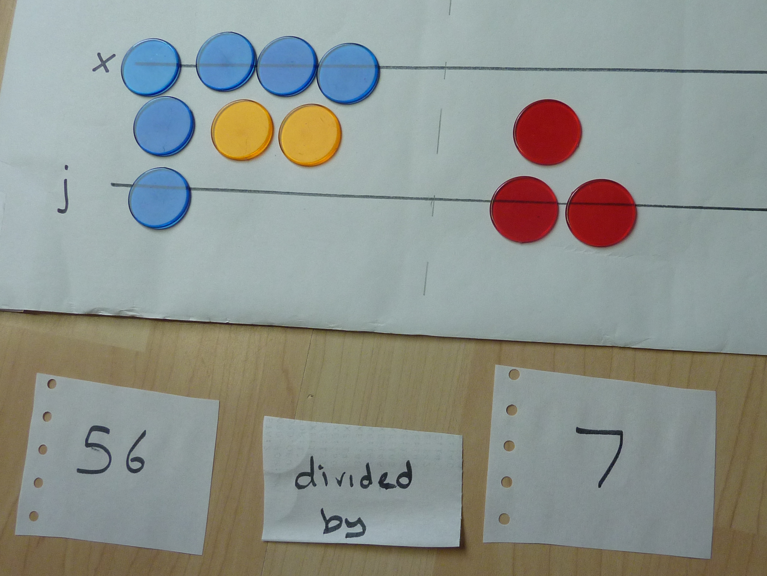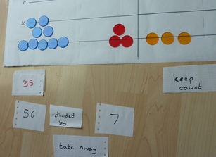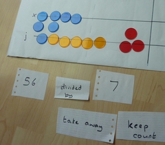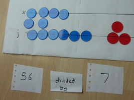 Let's start with 56 / 7. If you know your 7 times table, you will know the answer. Can we get it with a counting cloth? Lay it out, number to divide into on the left, number we are dividing by on the right: