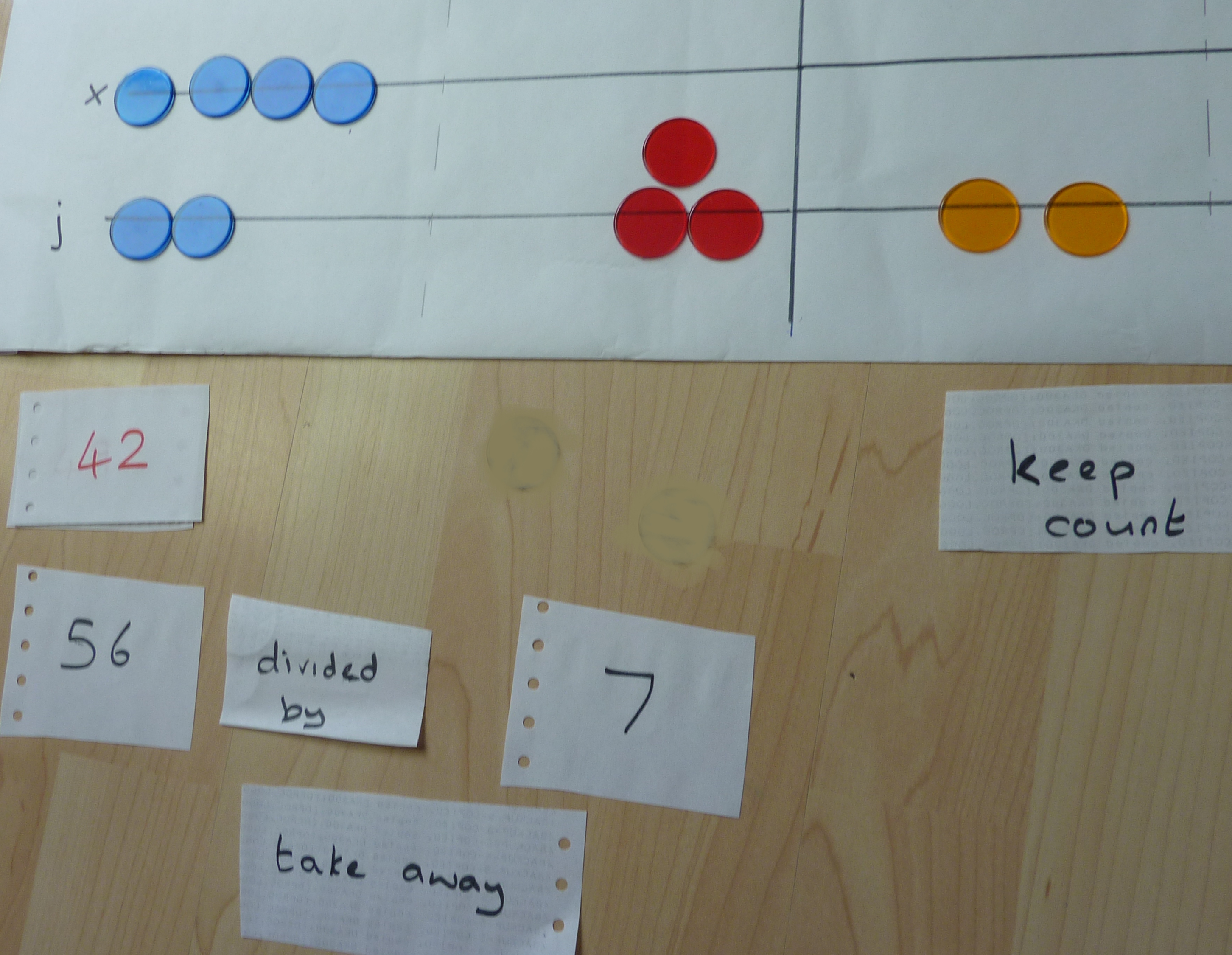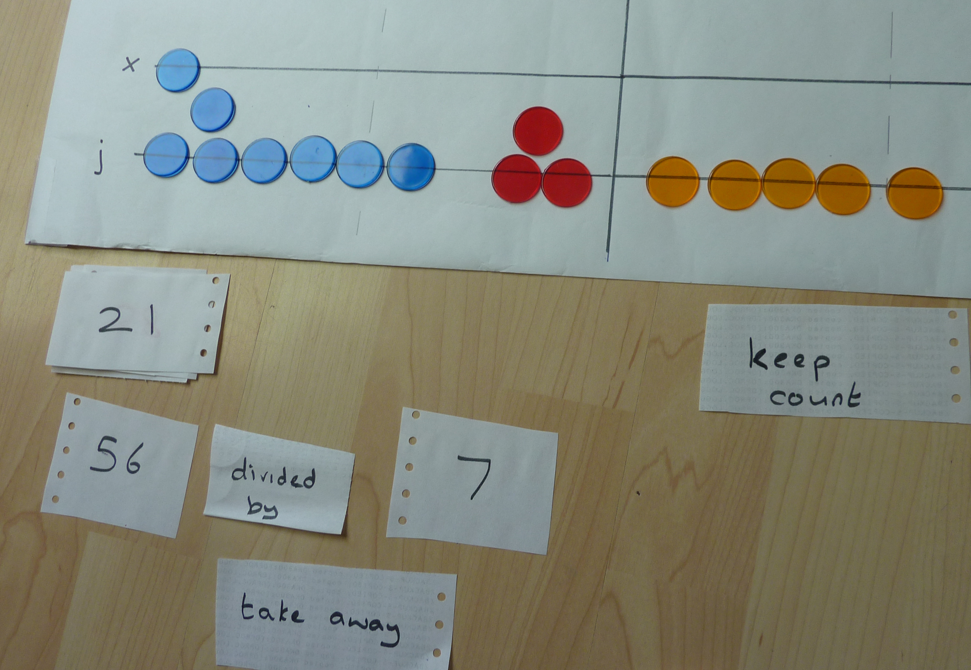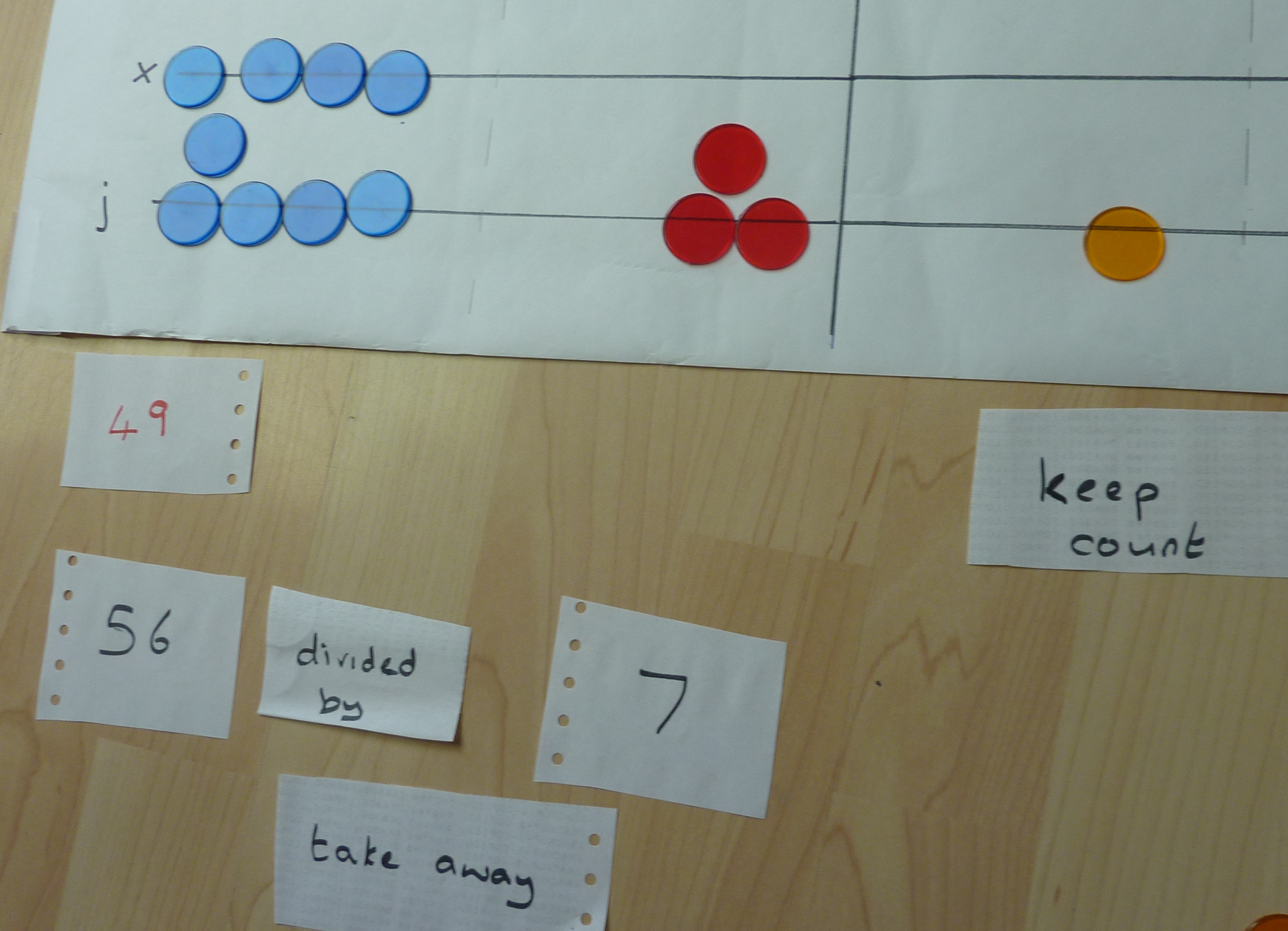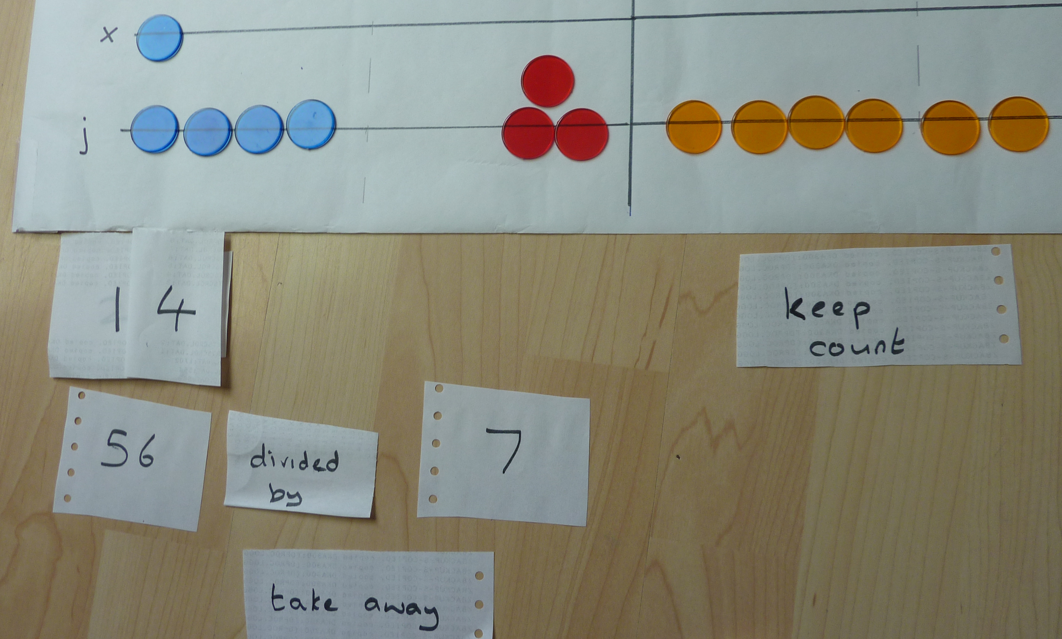 Let's start with 56 / 7. If you know your 7 times table, you will know the answer. Can we get it with a counting cloth? Lay it out, number to divide into on the left, number we are dividing by on the right: