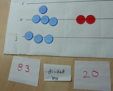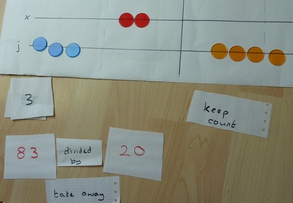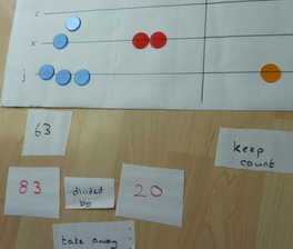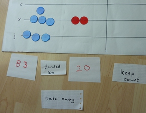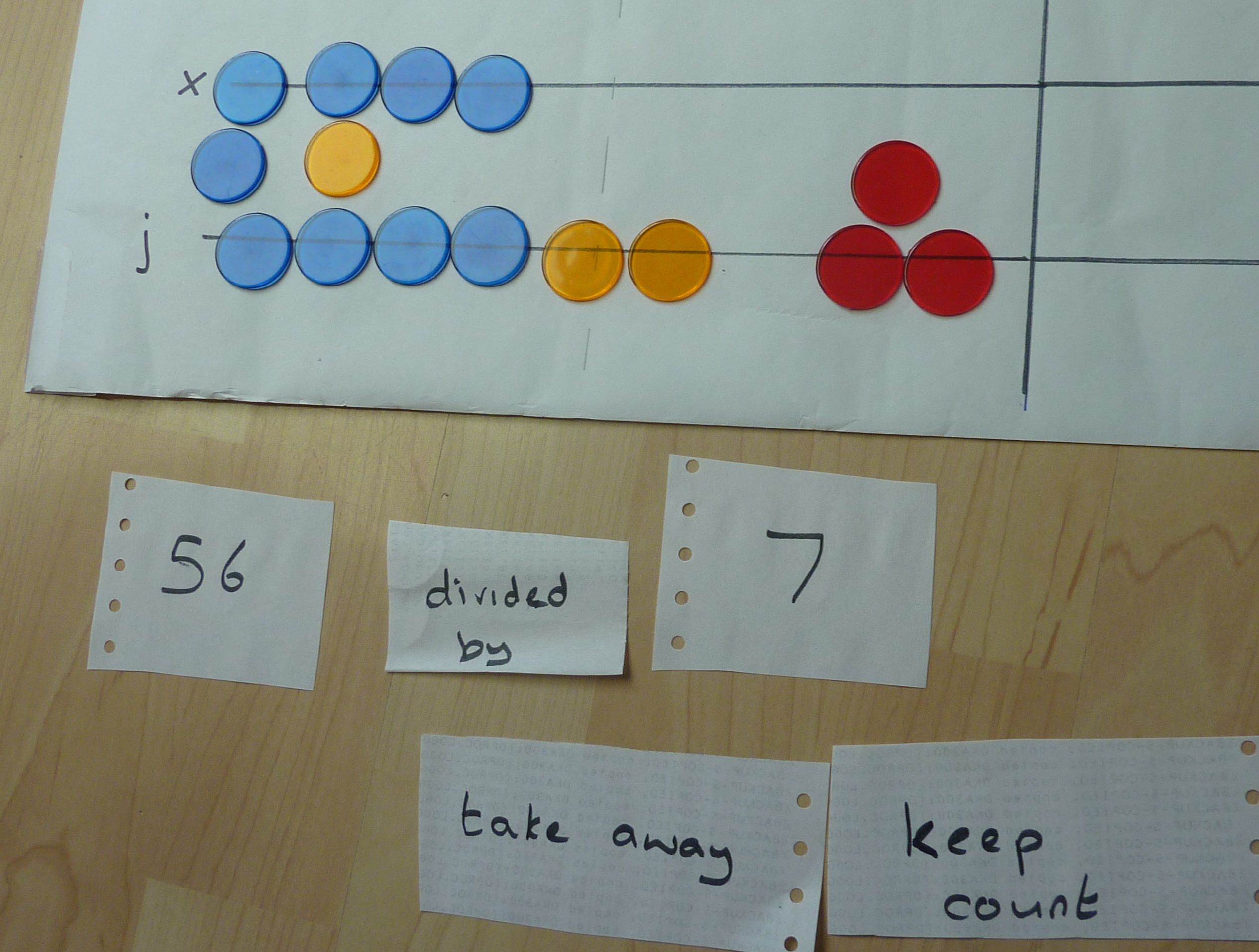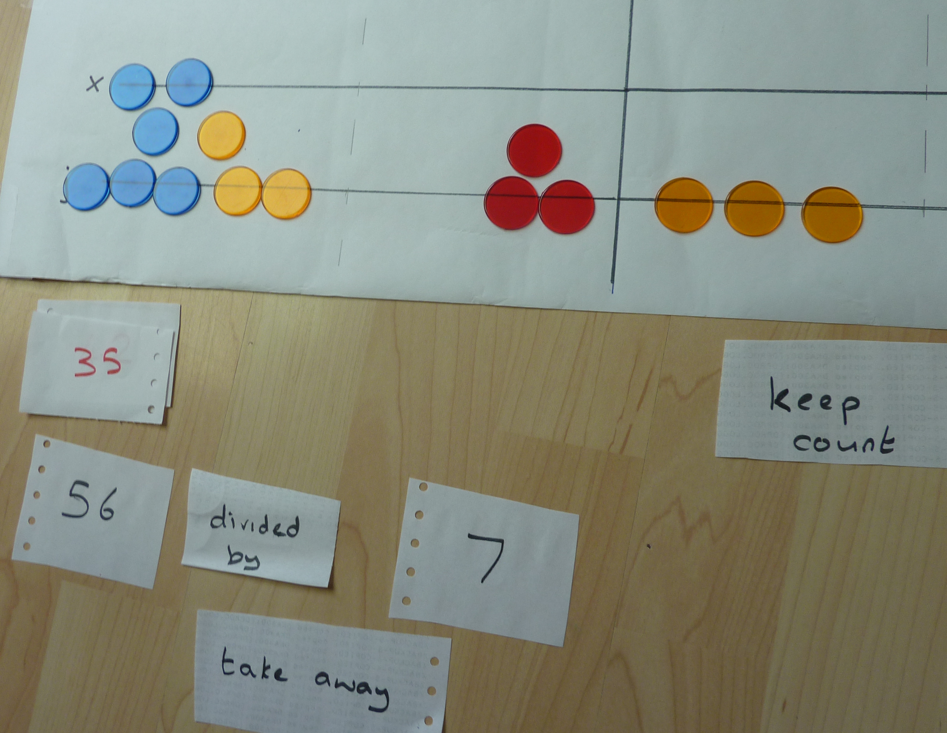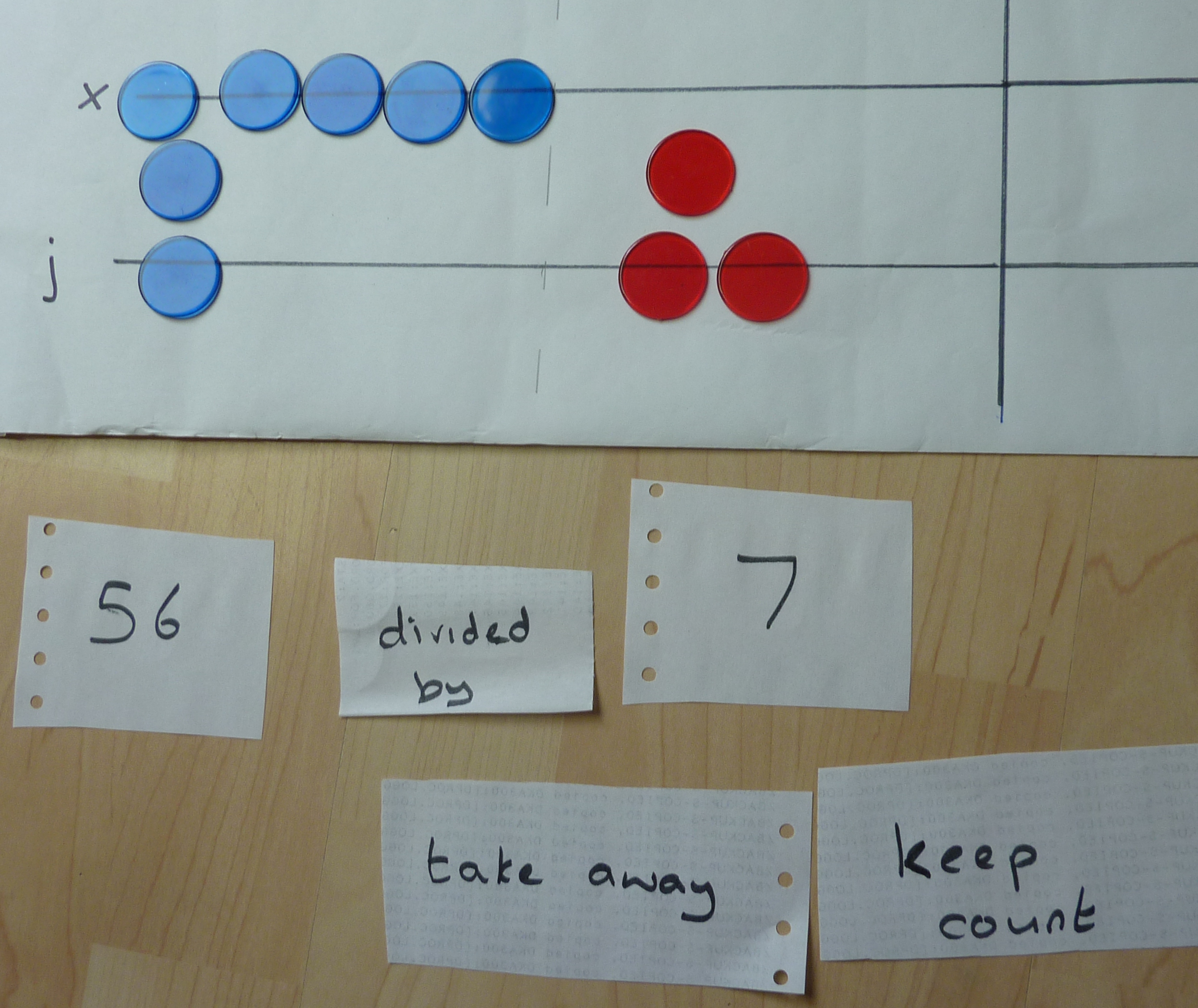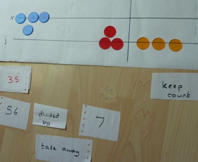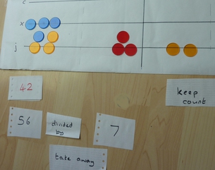 We want to use the third column to keep count how many times we have done the take away. While you are learning, tap the counters from the right hand column, while you match and take away from the left. You need to keep the red counters where they are so you don't forget what you are dividing by.