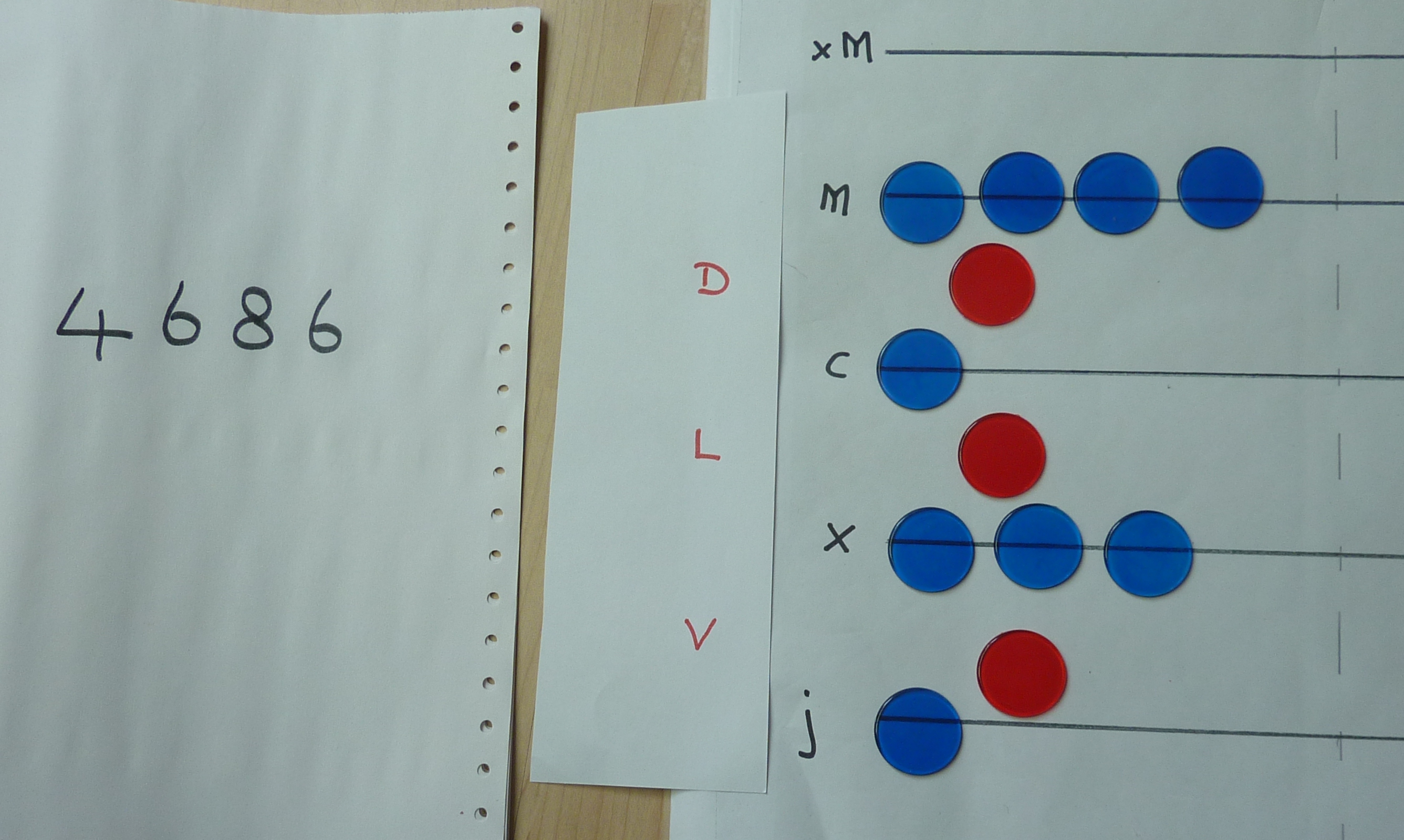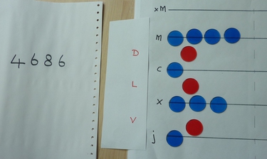 We use the spaces between the lines to represent those multiples of 5. We don't typically write the names in but I have shown them here for ease. I've swapped the red ones which were on the lines in the above picture for the ones in the gaps below. Five counters on the 1s line are replaced by one counter in the 5s space, similarly five counters on the 10s line is replaced by one in the 50s space, and five on the 100s line by one in the 500s space.