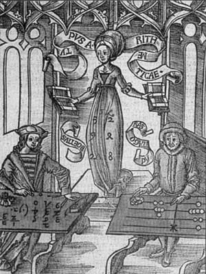 This image shows a competition between the counting board and arithmetic done by pen reckoning (we might call it "paper and pencil", but they didn't have pencils.) It is from G Reisch, Margarita Philosophica (1508).