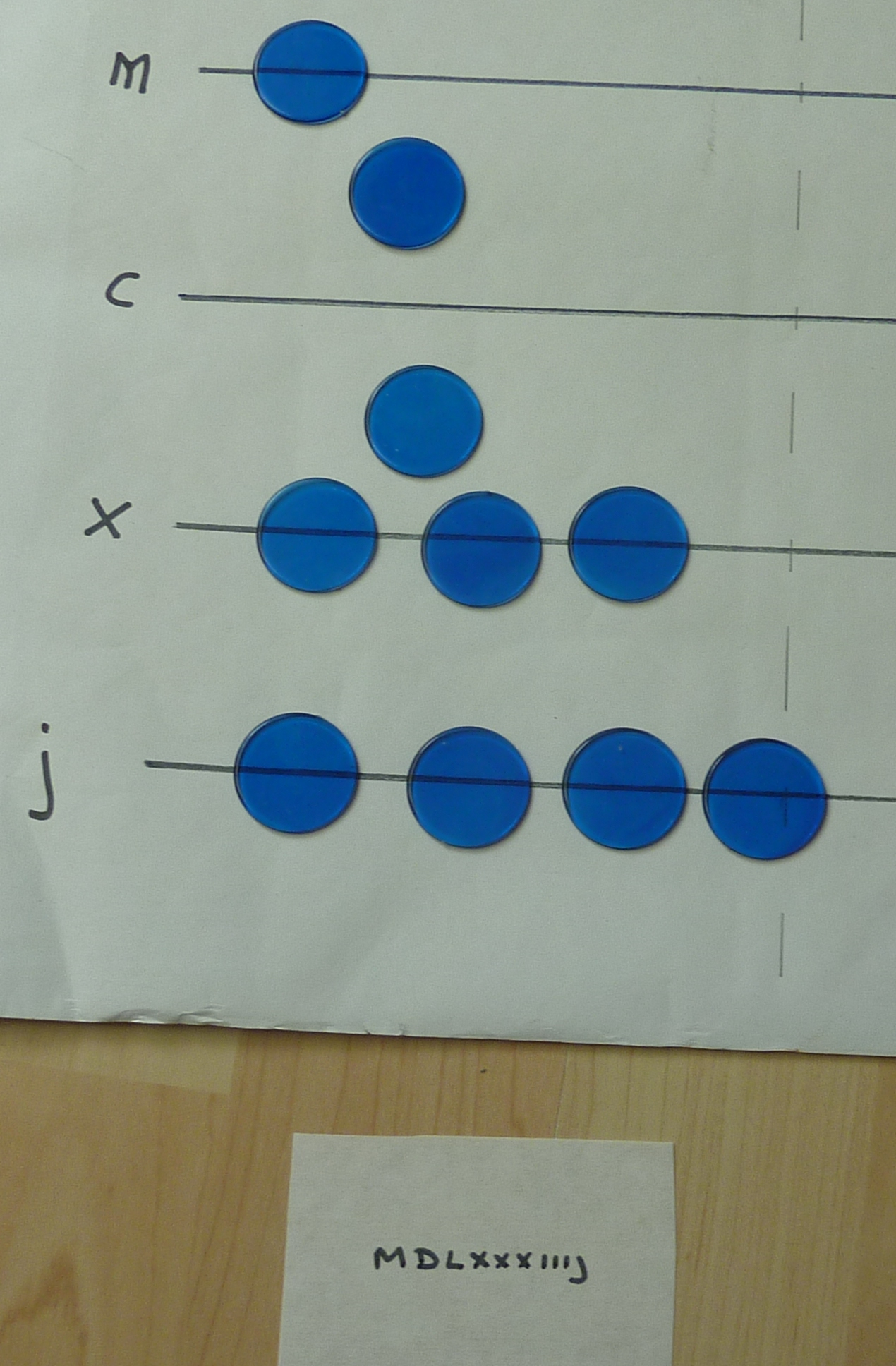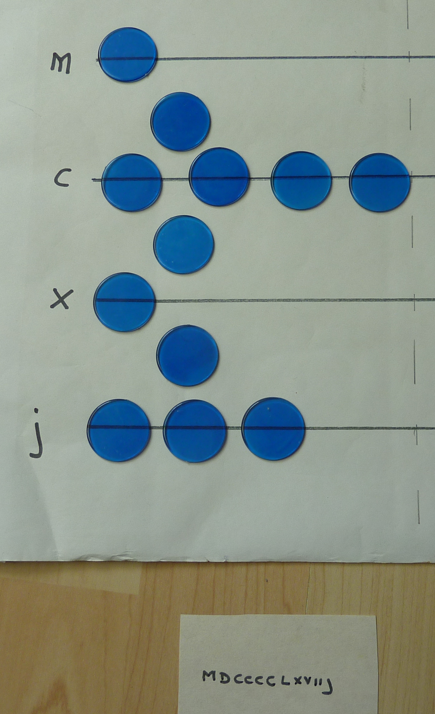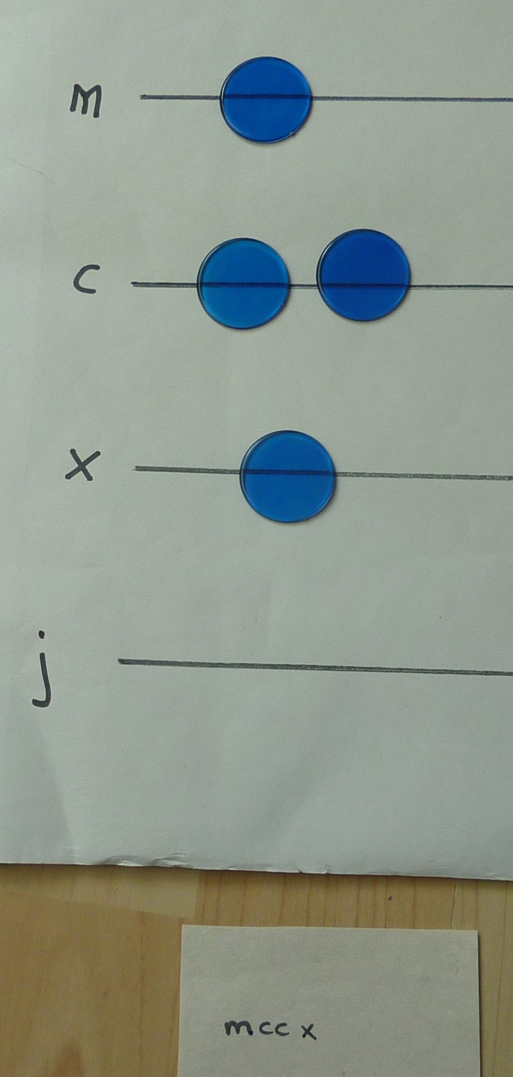 The bottom-most line is for the 1s, then the 10s, 100s, 1,000s and 10,000s. On my board, I haven't used "1", "10", "100" or "1,000", I've used J, X, C and M.