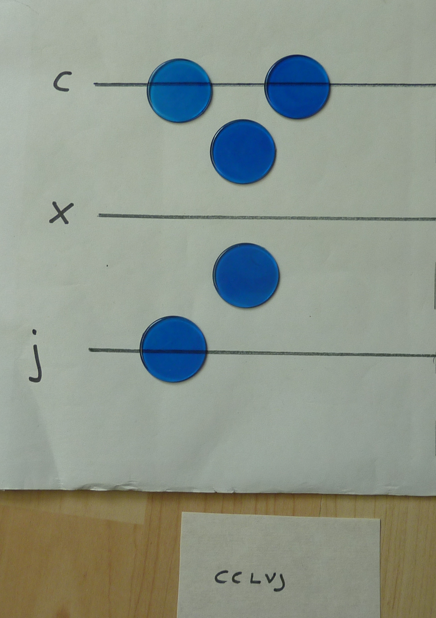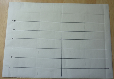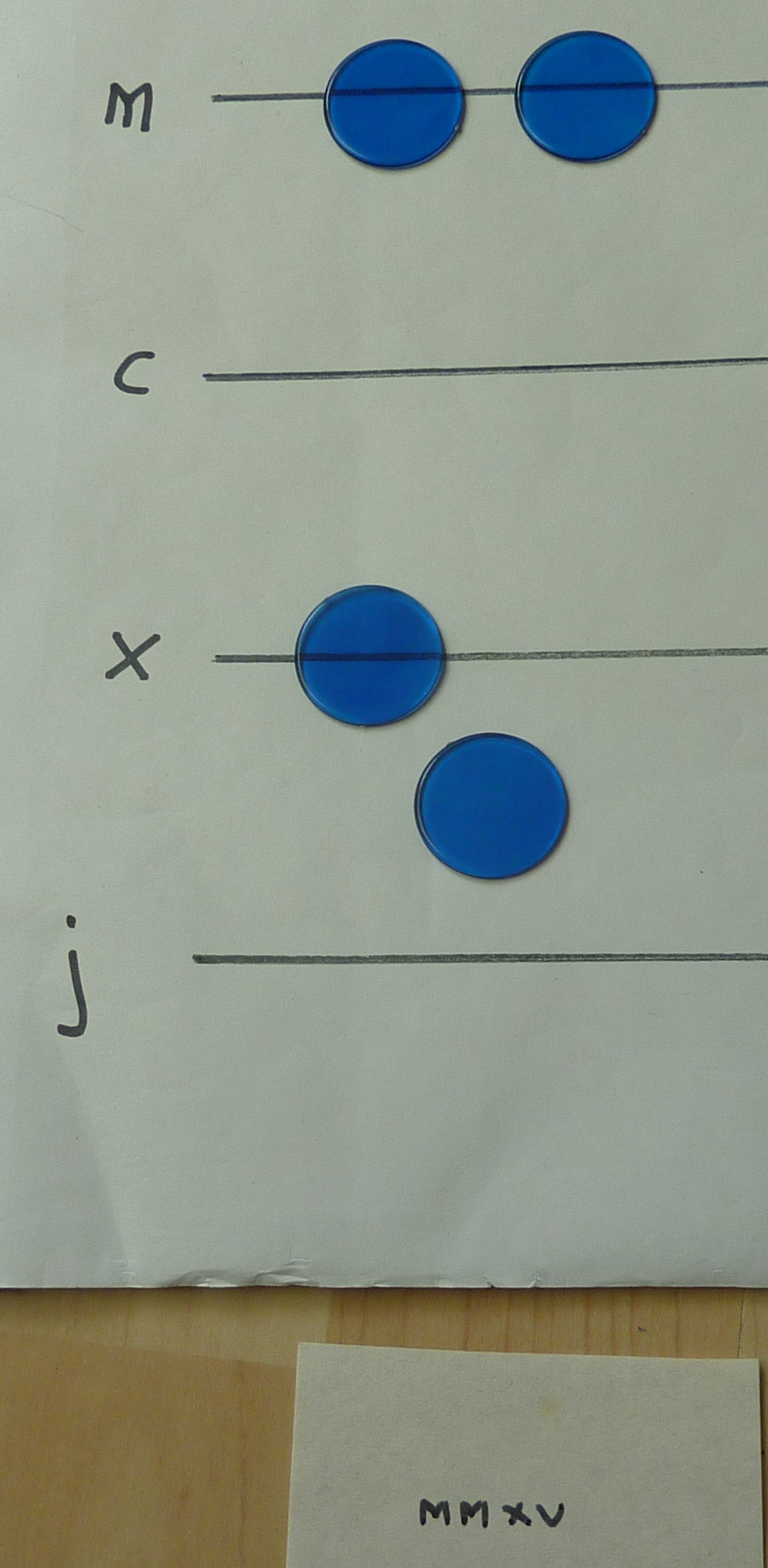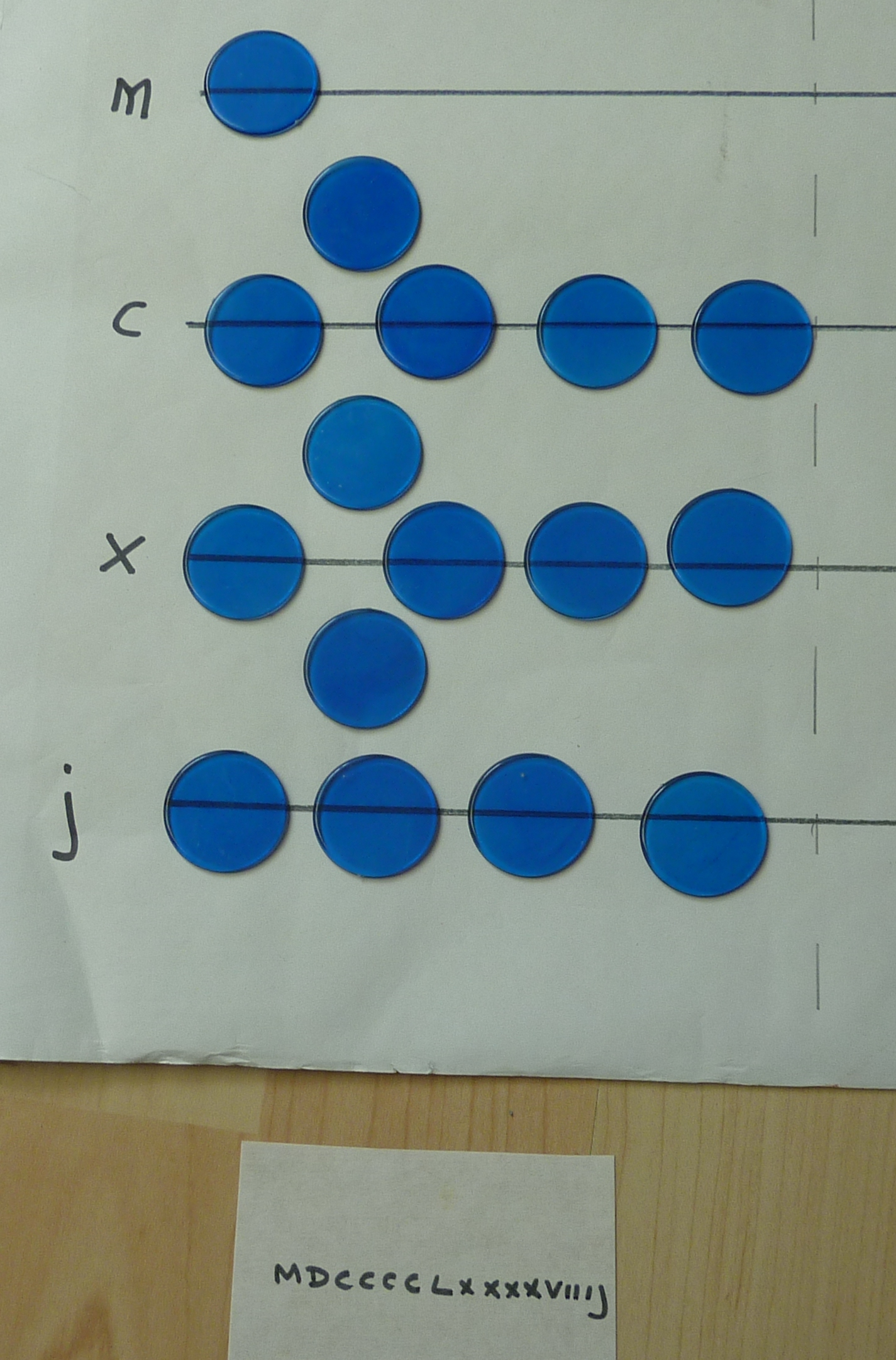 The bottom-most line is for the 1s, then the 10s, 100s, 1,000s and 10,000s. On my board, I haven't used "1", "10", "100" or "1,000", I've used J, X, C and M.