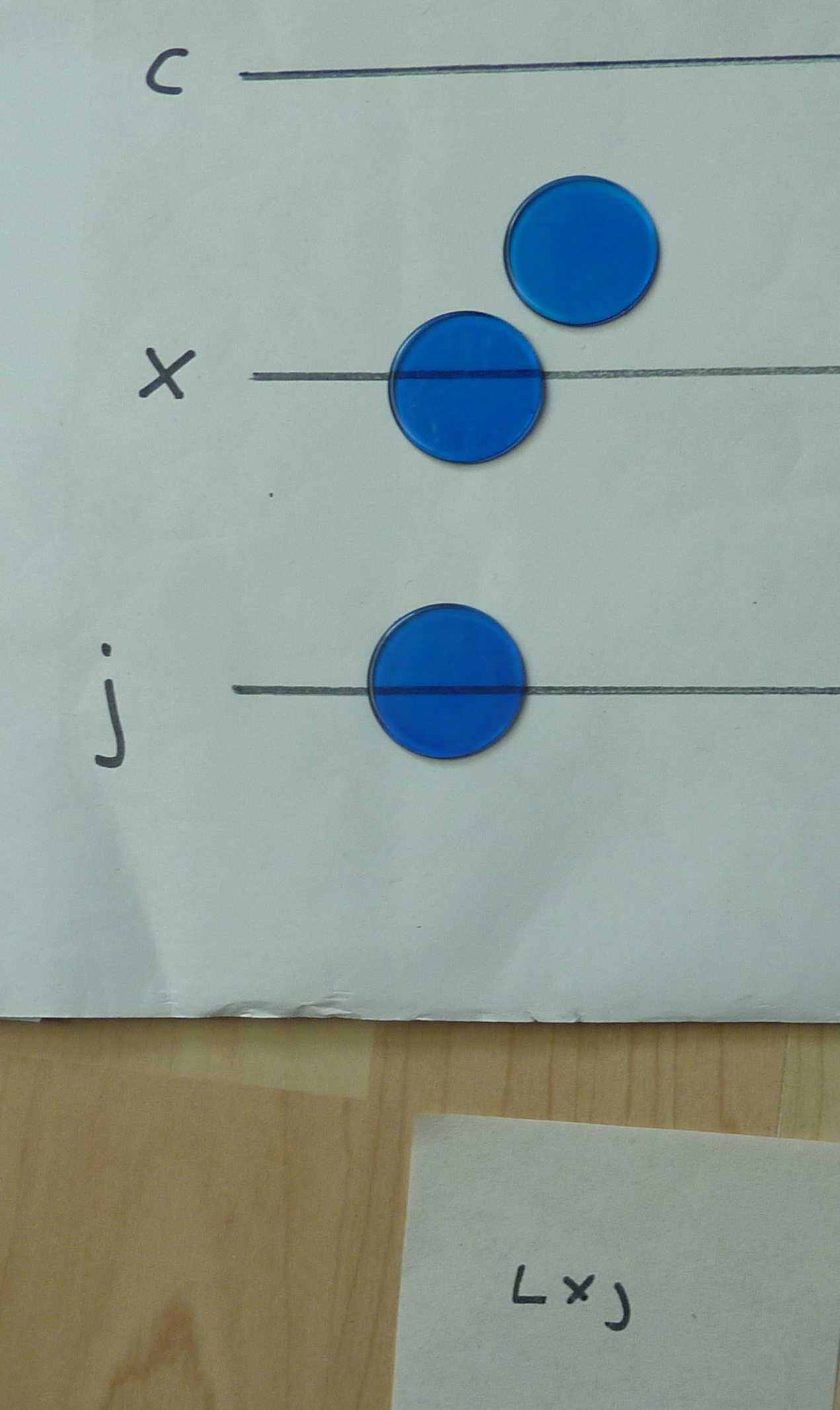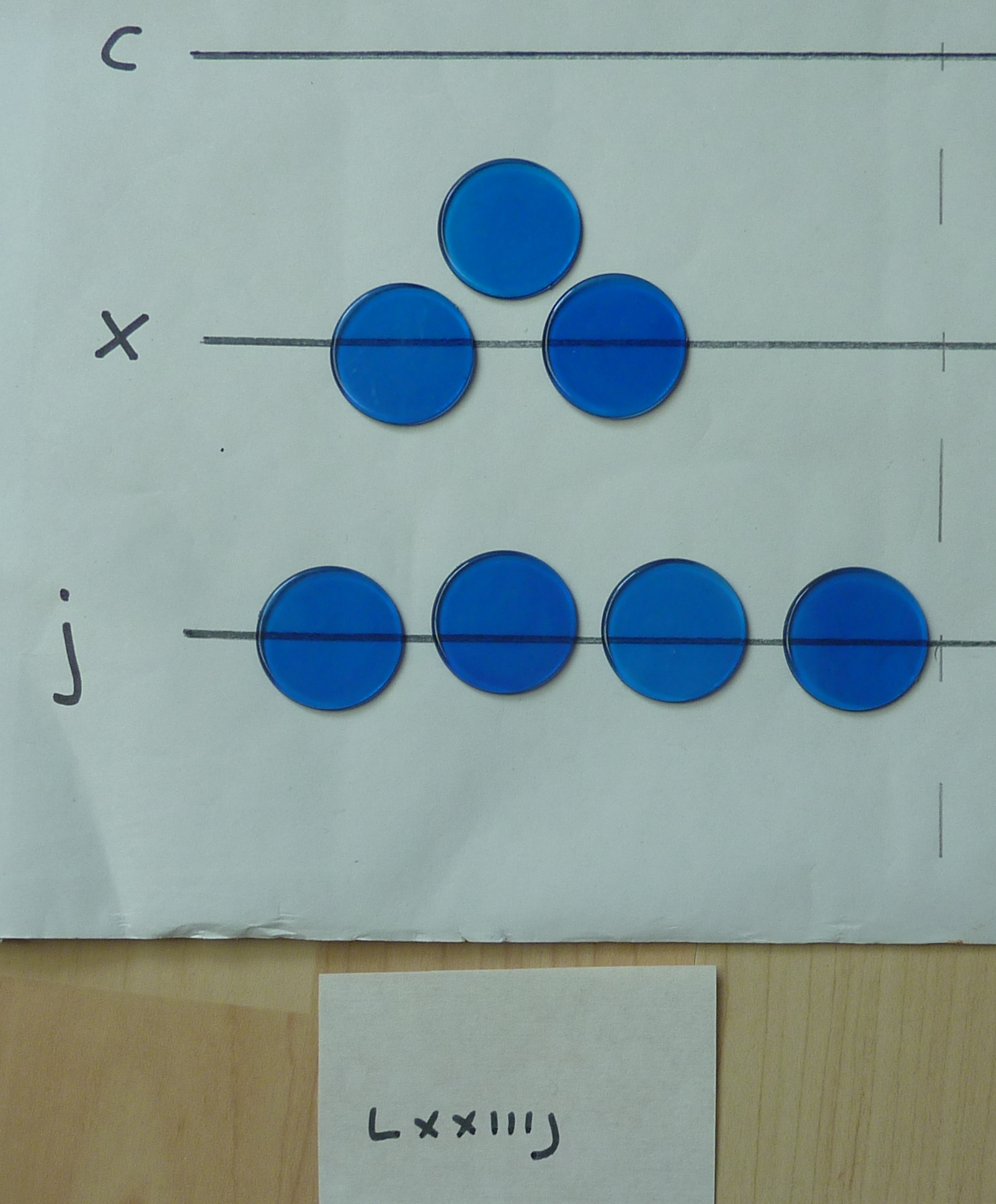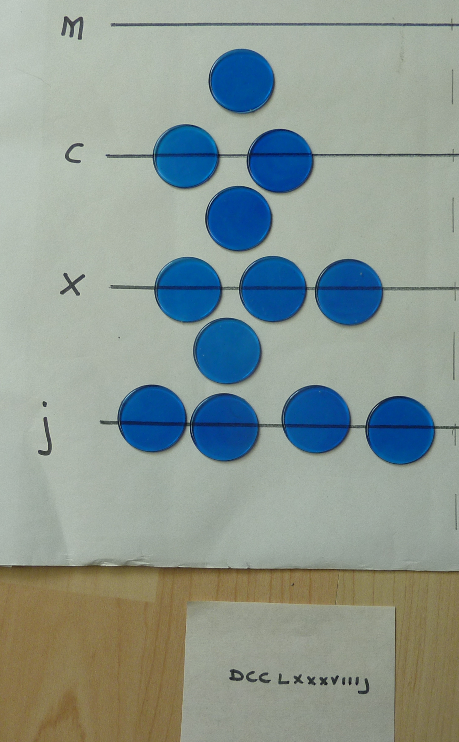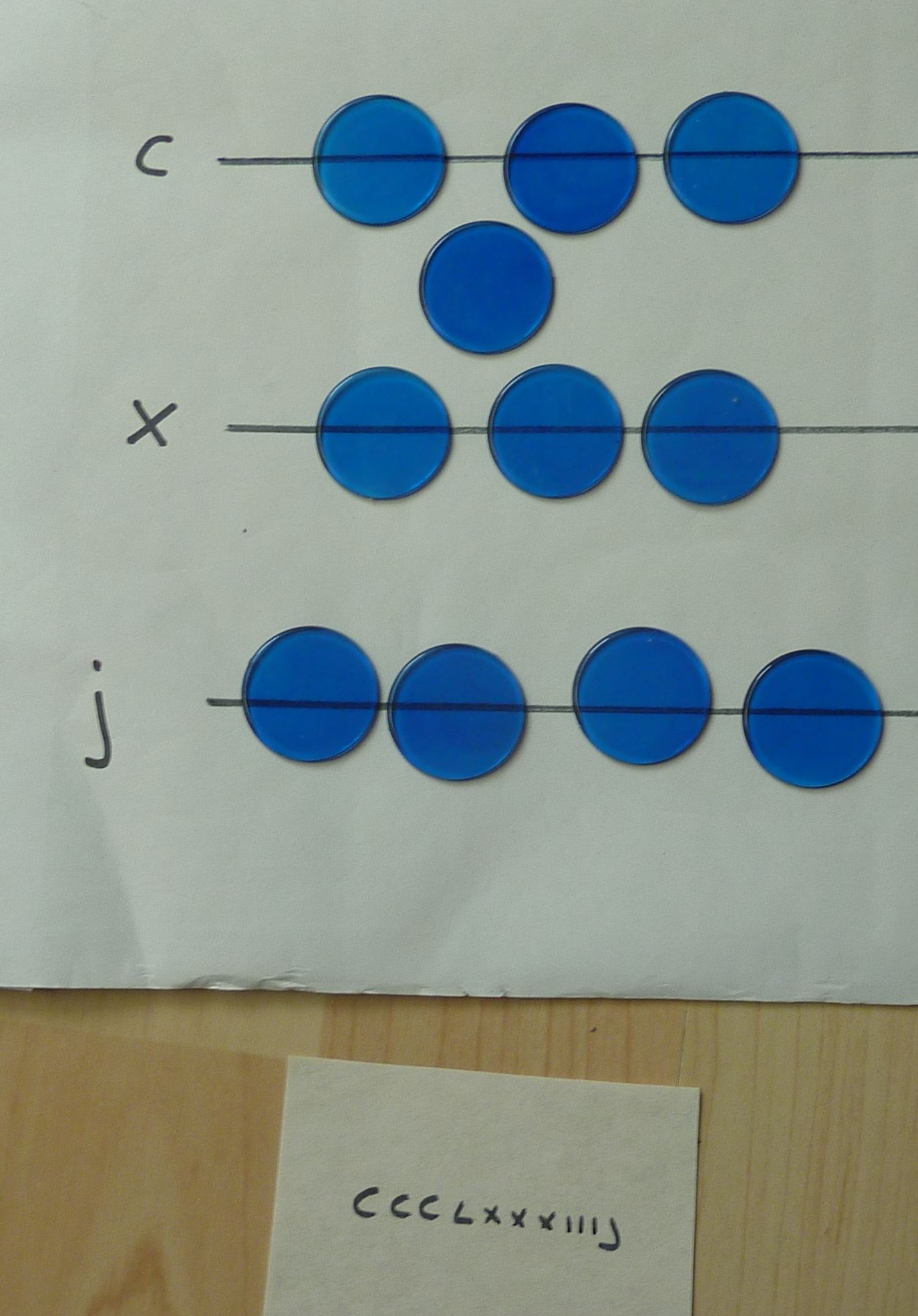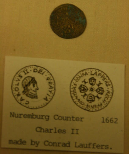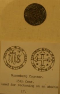 The counters were called "Jetons", and were about the size of a 1p piece. Many were made in Nuremberg. They were quite detailed, as you can see from these which were found in Haddon Hall in Derbyshire. This is so that a merchant would be certain none were sneaked onto his cloth during calculations; he could identify his own at a glance. For practise, I find 2p sized tiddly winks are handy. In this tutorial, I am using different colours so that you can see which counters I am currently working with.