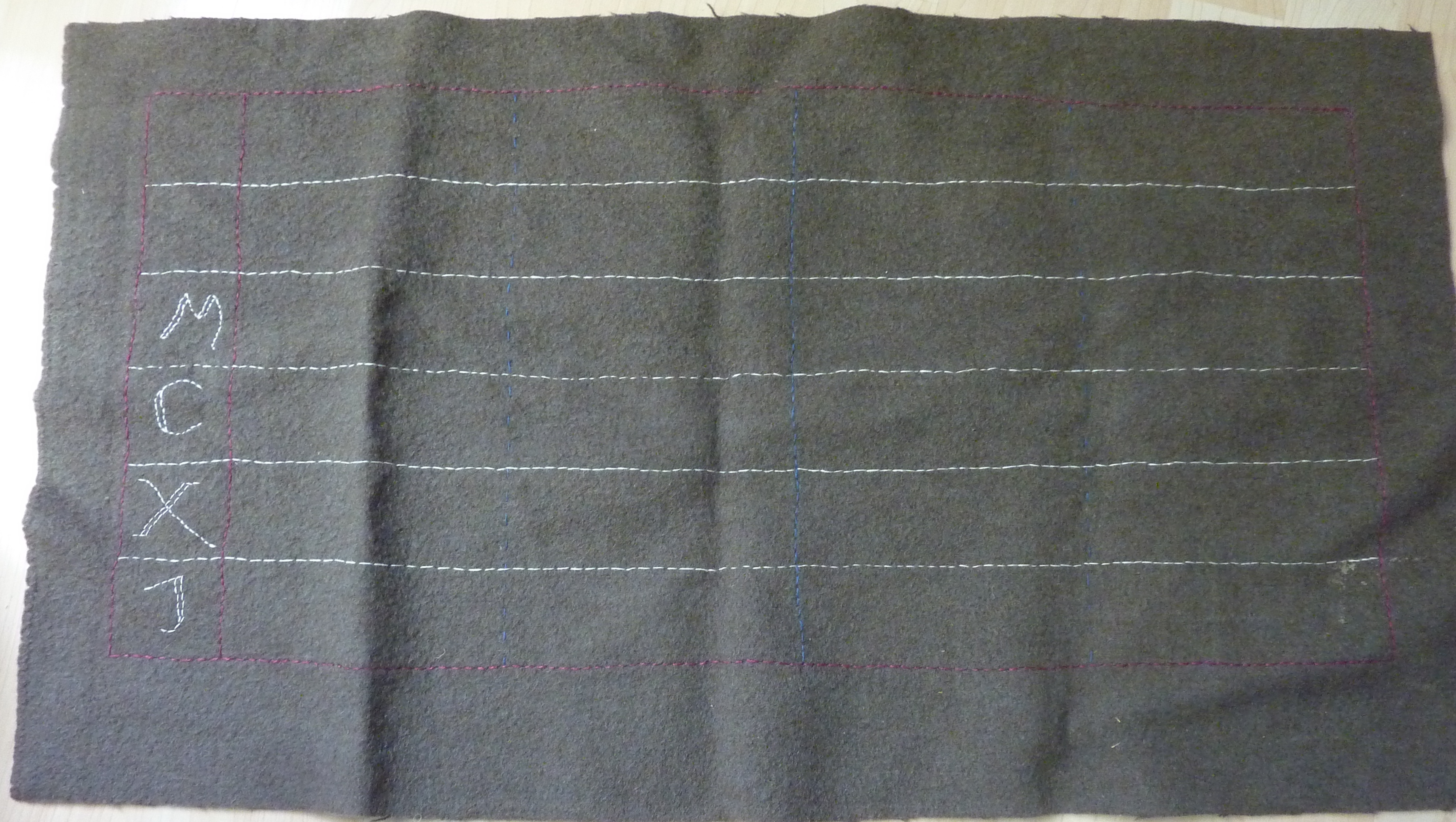 This image shows my Tudor style counting cloth. Nice and portable, but because of the raised lines due to the sewing, I am using spaces rather than lines to represent the 1s and 10s etc. There are dark blue lines to mark the vertical divisions, but they are pretty hard to see in my photo. It is made from dark green well felted wool and some linen thread.