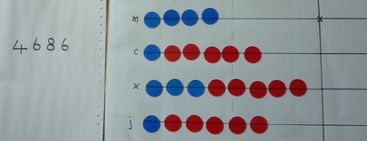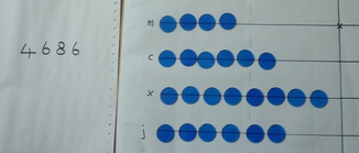 Here is 4686 represented on the board. This has 4 counters in the 1,000s row, 6 in the 100s, 8 in the 10s and 6 in the 1s. As you can see, this takes a fair few counters and we're trying to save dealing with quite so many.
